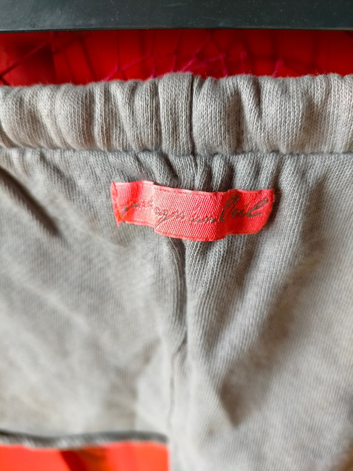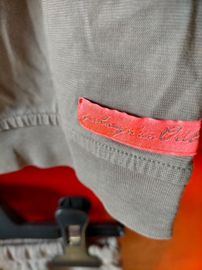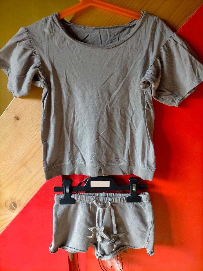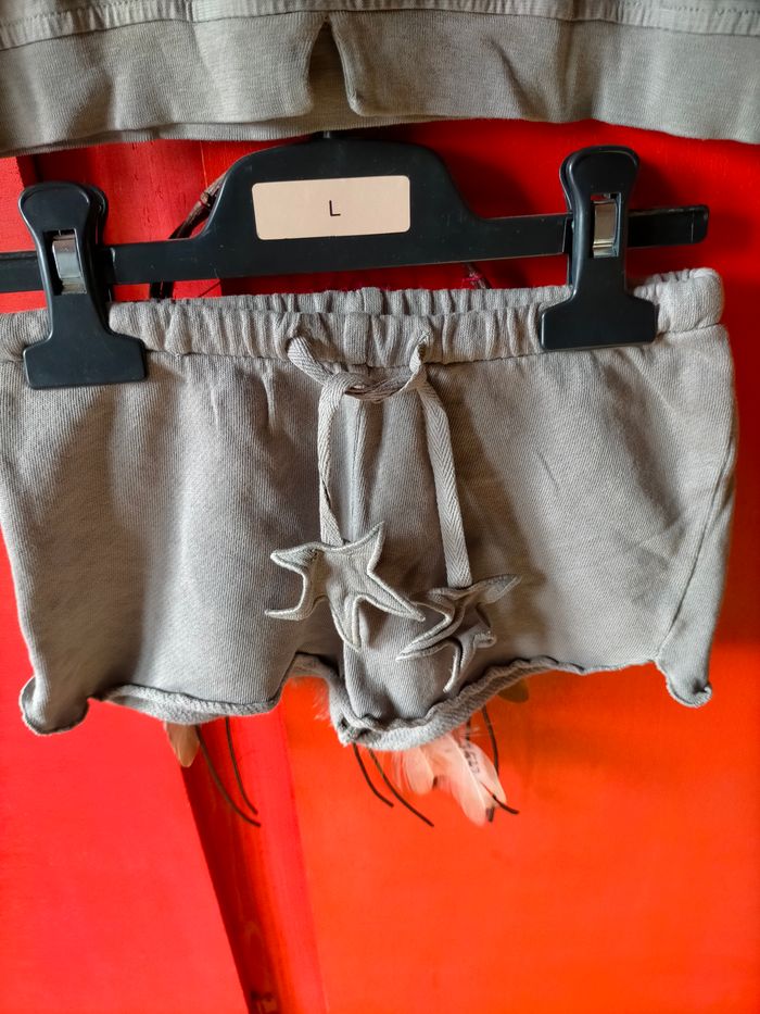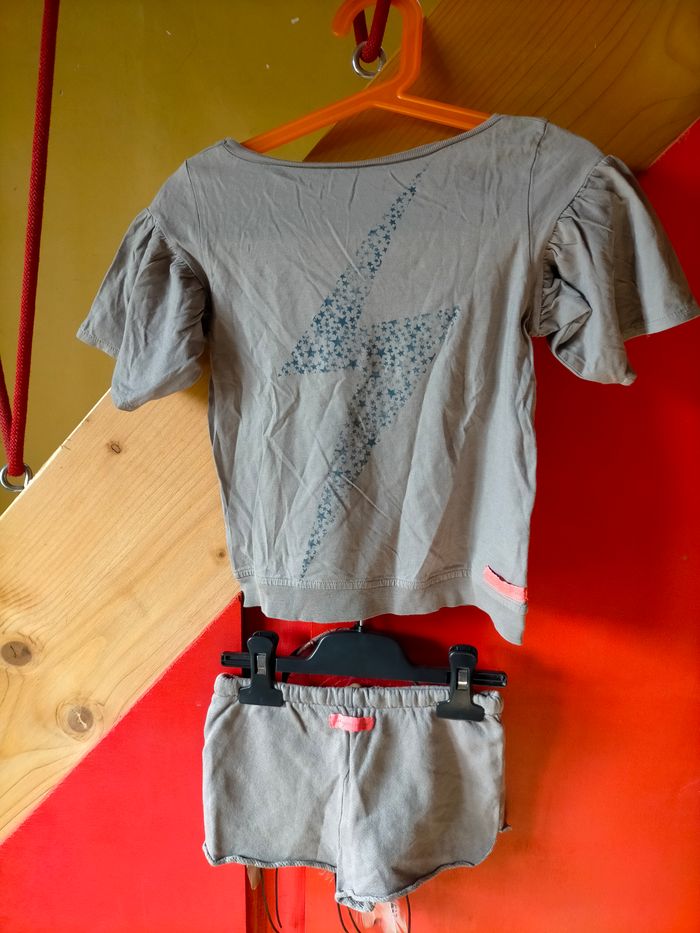 TBE Ravissant ensemble de créateur en jersey de coton gris/kaki composé d'un tee-shirt à manches volants et motif d'éclair au dos et son short à taille élastique avec lien à la taille terminé par des étoiles. Étiquette de la marque fluo au dos Un look qui se démarque pour ce vêtement de créateur. Prix d'achat 92 euro