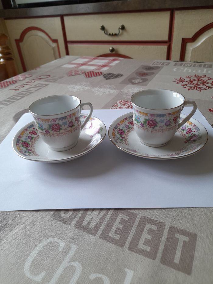 2 tasses à café avec soucoupe Porcelaine de chine hauteur 5,5 cm diamètre 6 cm neuf jamais utilisé 3 euros