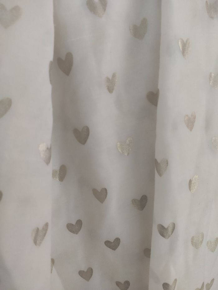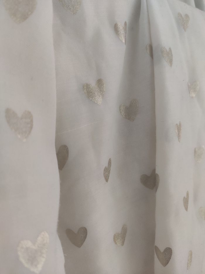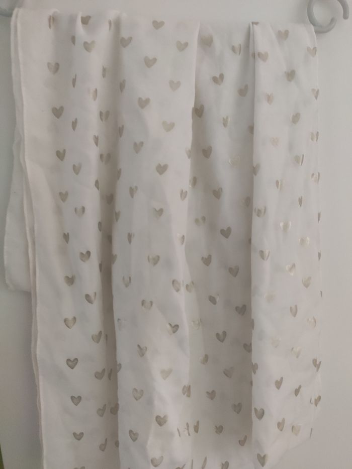 Un tour de cou couleur blanc crème avec plein de petits cœurs dorés. Dimension 68 cm x 88 cm. Bon état, bien mis, fines bouloches. Pas de marque, je sais plus où je l'ai acheté