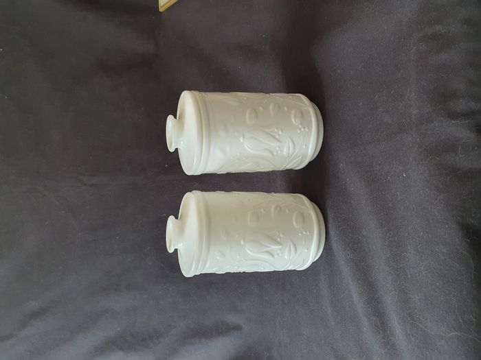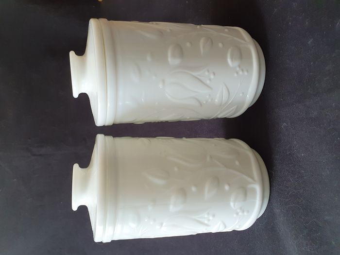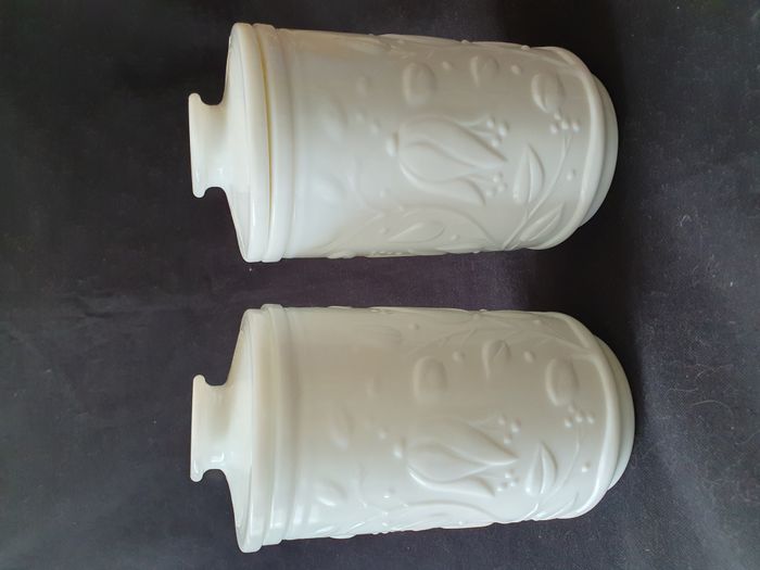 10 Lot de 2 pots en verre opale blanc motifs feuille en relief style arcopal