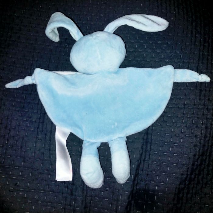 Doudou plat lapin bleu, blanc grelot Tom et Kiddy Bisous d'ange - photo numéro 1