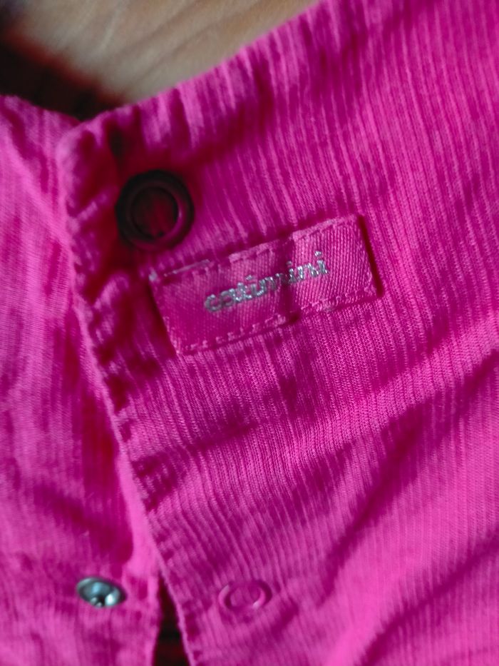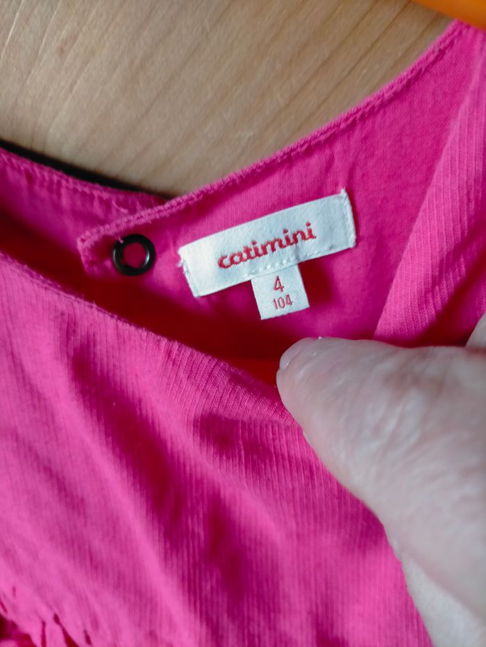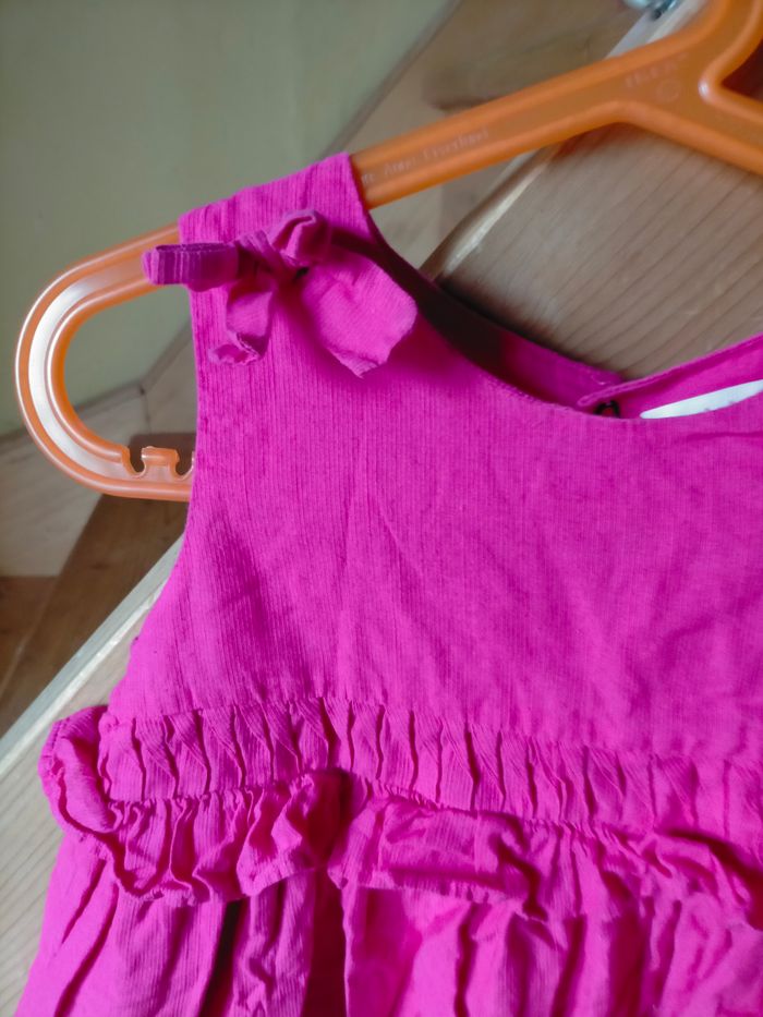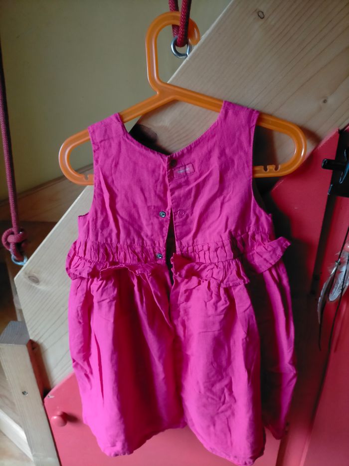 Excellent état. Très belle robe sans manche en coton côtelé fuchsia. Petits nœuds aux épaules, volant froufroutant devant, pressions et étiquette catimini au dos. Toute doublée. Très élégante