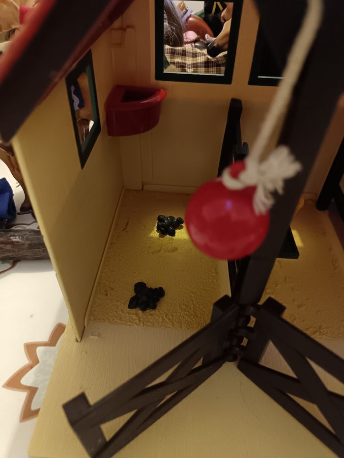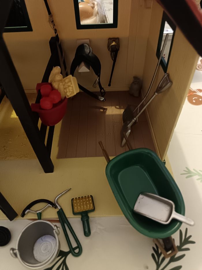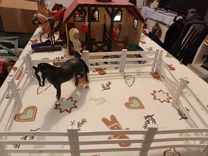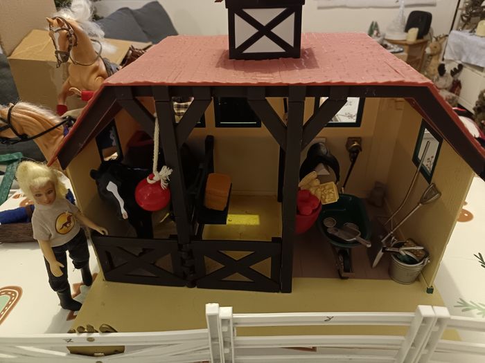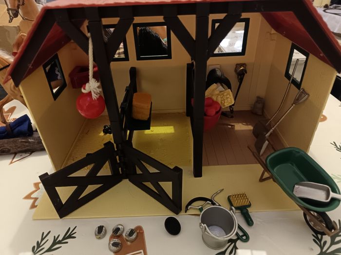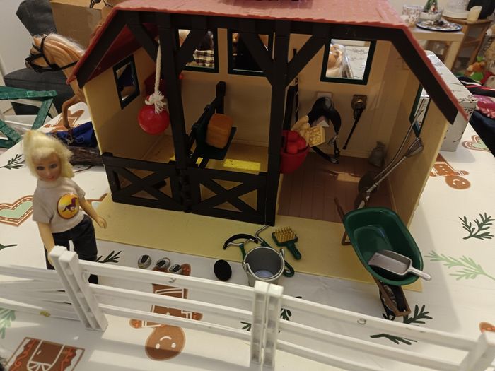 La grande écurie est composée de : - une poupée - un cheval (avec 4 fer à cheval qui s'enlève des sabots) - la clôture ( un peu abîmée mais complète) - plusieurs accessoires : selle, bride, outils de nettoyage, faux crottins, nourriture, brouette... (Voir photos) Les figurines de chevaux Grand Champions sont une série de jouets fabriqués entre la fin des années 1980 et les années 2000 par Empire Toys (puis d’autres sociétés après la faillite d’Empire) les grands champions ont définitivement disparu en 2007.
