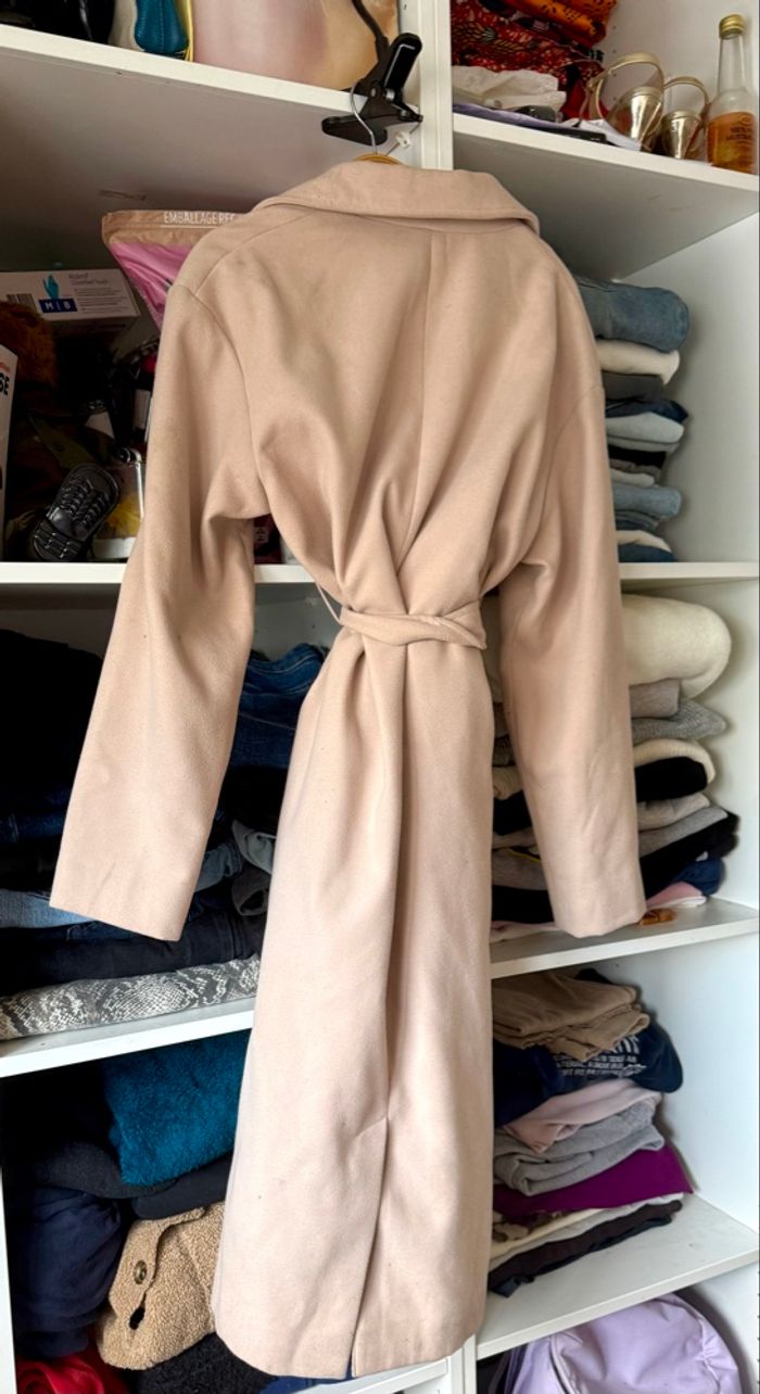 Manteau Missguided femme, taille 34, couleur beige clair. Coupe longue et élégante avec ceinture à nouer à la taille, col à revers et manches longues. Matière douce, doublé pour plus de confort. Peu porté mais non utilisé depuis plusieurs années, bon état général. Je m’en sépare pour faire de la place dans mes armoires.