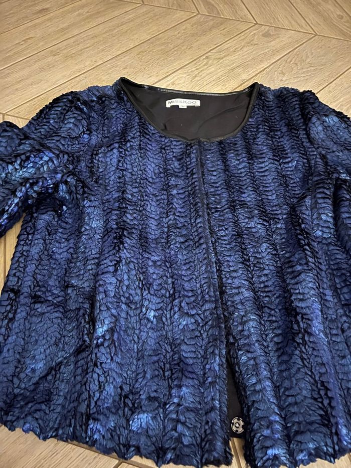 Veste élégante en velours texturé bleu profond. Les manches sont longues, la coupe confortable (taille L). Le tissus est assez épais. Parfaite pour soirées ou looks casual chic, texture veloutée comme neuve. État impeccable, lavable à froid. Envois tous les jours et soignés depuis le 66