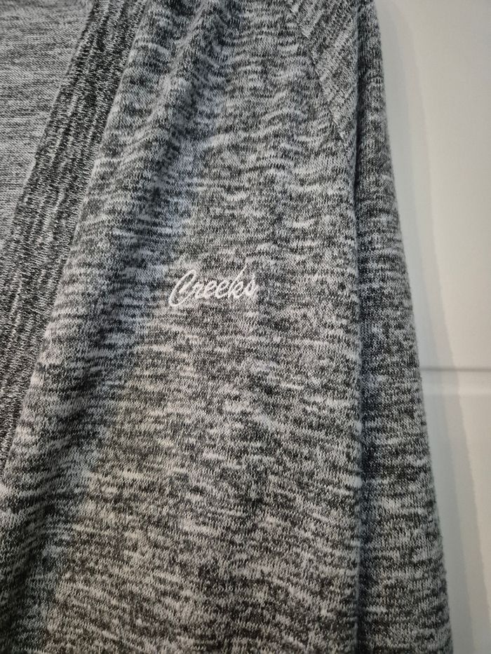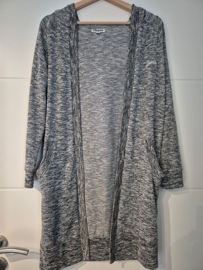 Gilet long a capuche Gris moucheté Marque creeks Taille S Longueur 91cm Très bon état