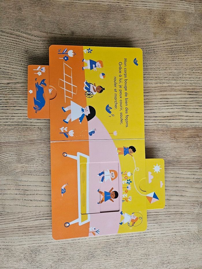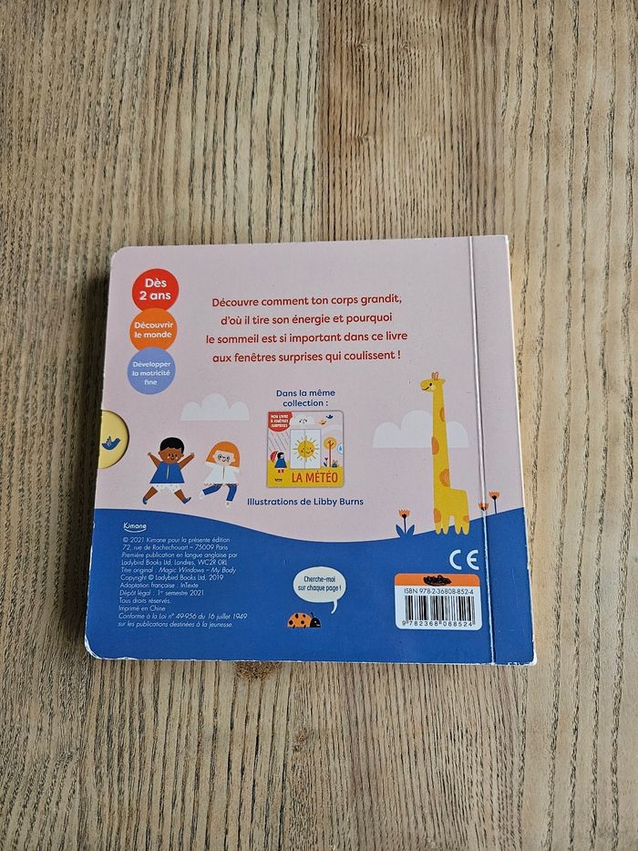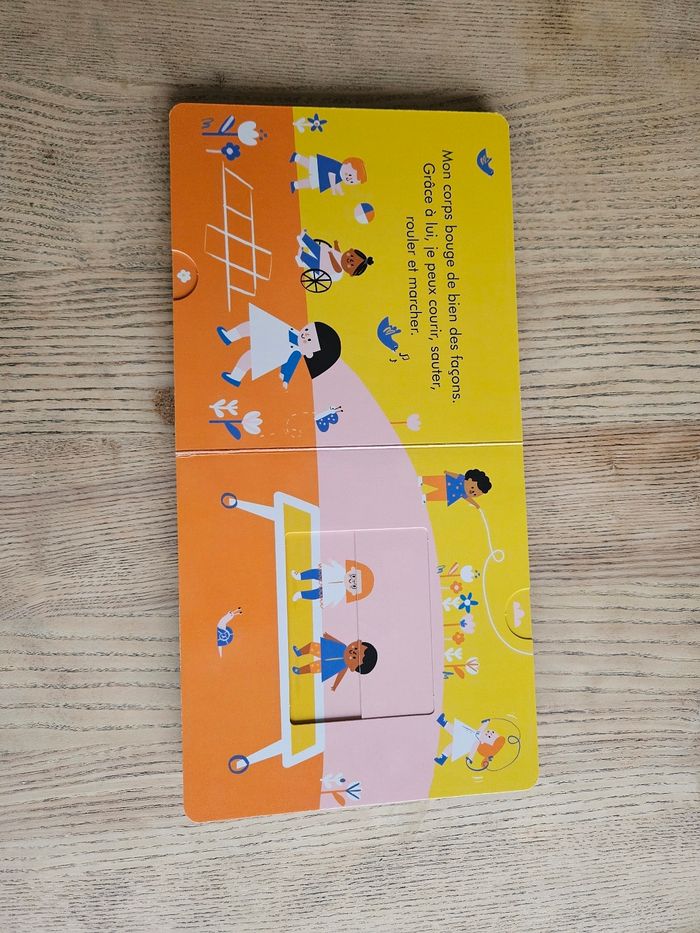 Livre en carton à rabats thème du corps qui plait beaucoup aux petits. En très bon état. Quelques marques d'usures normales, cf photo avec mon doigt et angles du livre. Peut encore connaitre de belles histoires 🤩.