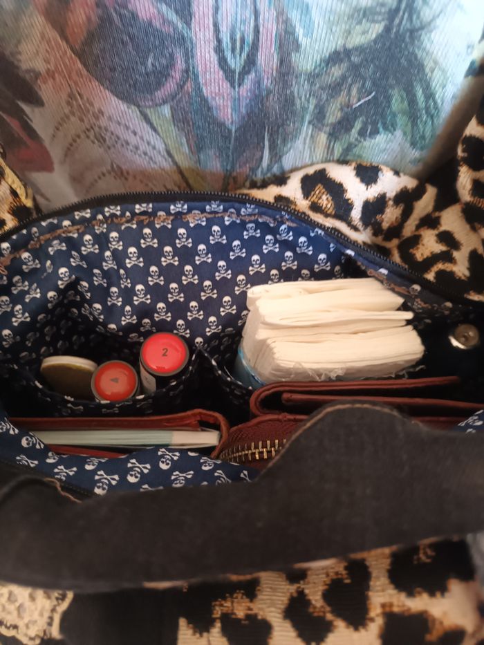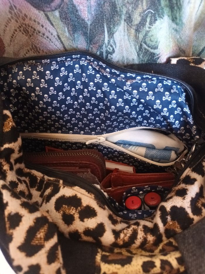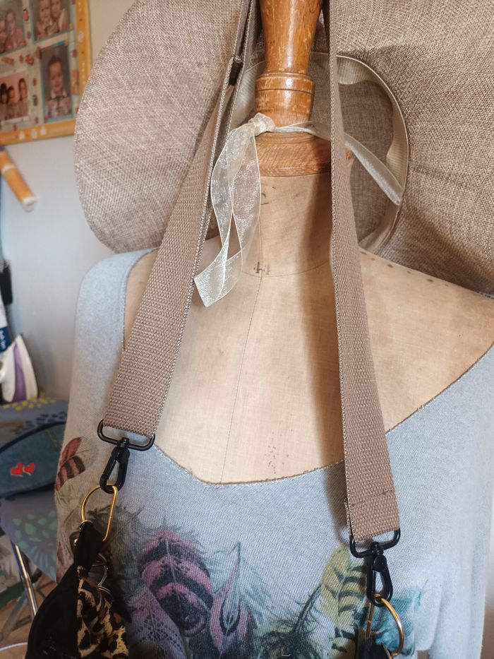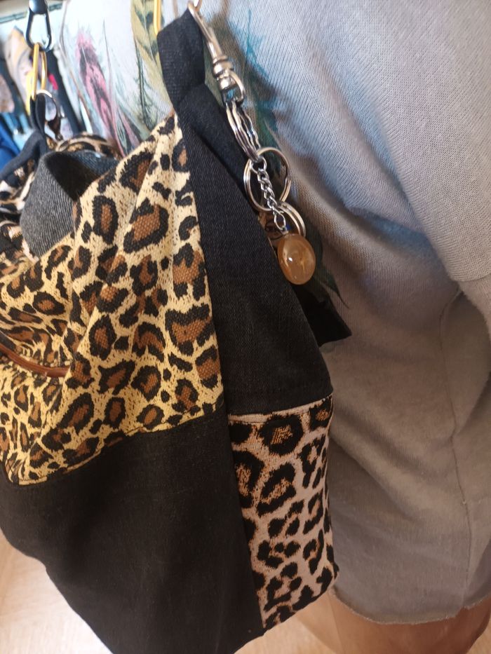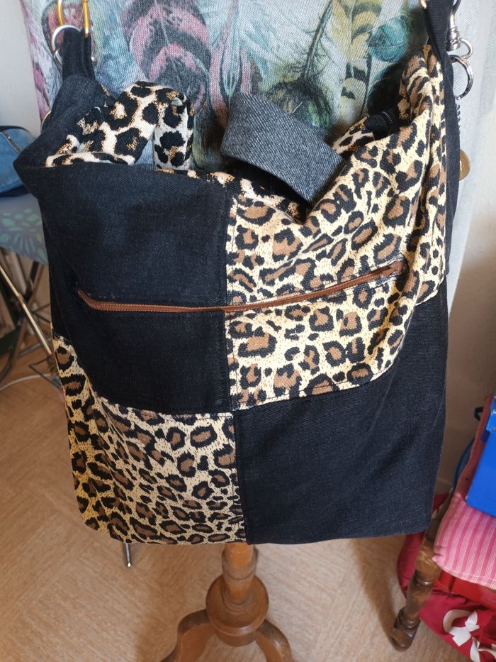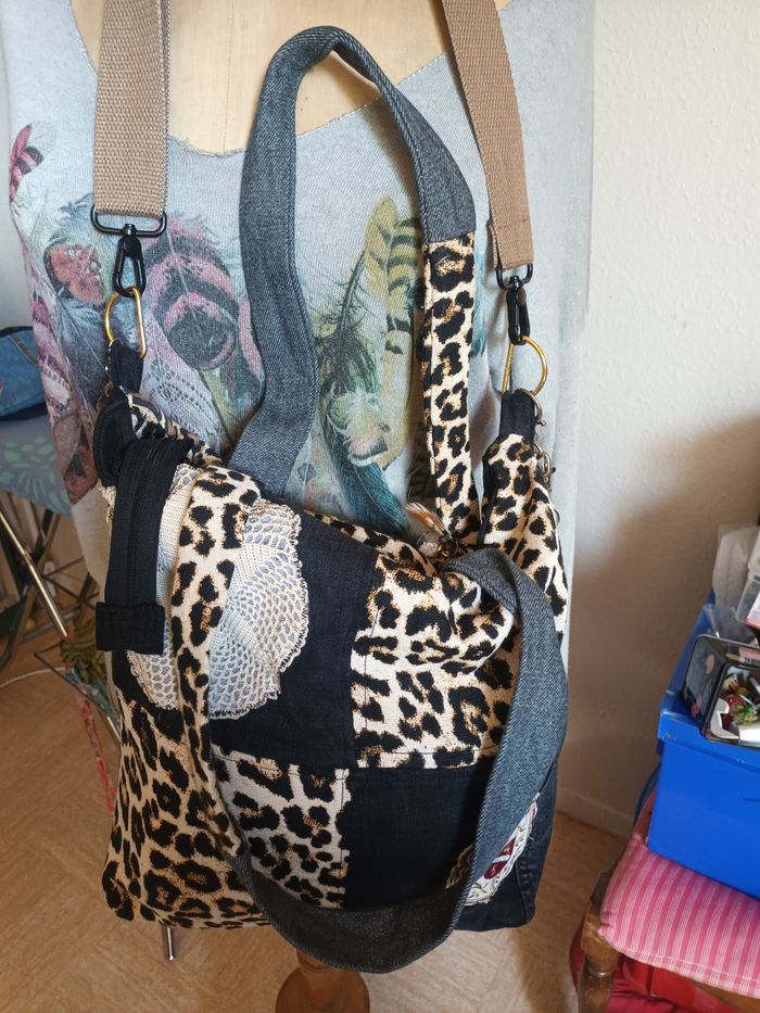 Sac pièce unique, artisanal ,fait avec jeans, tissu recyclé il ni à que les mousquetons et anneaux acheté,poches intérieure, et une extérieure ferme par une fermeture ,le sac ceux fermé avec une fermeture