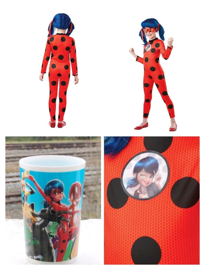 MIRACULOUS - LADYBUG 5/6 ANS. Votre enfant sera content de revêtir ce déguisement afin de se transformer en Ladybug comme dans le dessin animé Miraculous !.. - DÉGUISEMENT LADYBUG RUBIE'S RÉF/ 300778- 5/6 ANS: 110/116 CM. Ce déguisement se compose d'une combinaison manches longues en tissu Jersey rouge à pois noirs avec attaches velcro dans le dos et impression lenticulaire sur le top. Un masque souple assorti aux couleurs de Ladybug. (Perruque et ballerines non incluses). Cette panoplie est idéale afin de stimuler l'imagination de votre enfant qui pourra s'inventer de nombreuses aventures comme Marinette. - MIRACULOUS LADYBUG VERRE RÉUTILISABLE 220 ML- Matière: Polypropylène, hauteur 10 cm, impression recto/ verso. Spécialement adapté pour les enfants, illustré de votre héroïne préférée. Ce verre est tout à fait résistant à la chaleur et facile à nettoyer. Parfait pour les boissons préférées, pour déco sur un bureau en guise de Porte-crayon ou autre... PACK À 12 € Une belle attention cadeau pour un Anniversaire ou autre occasion.