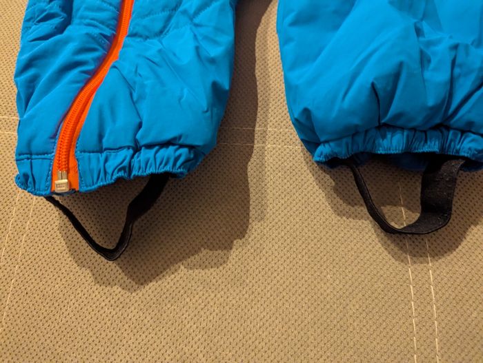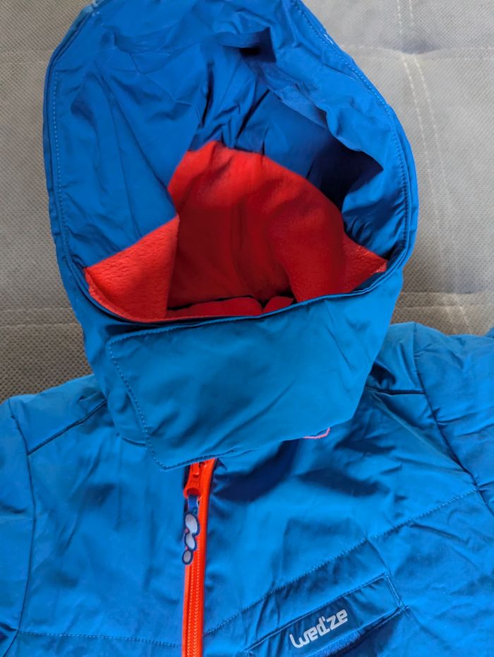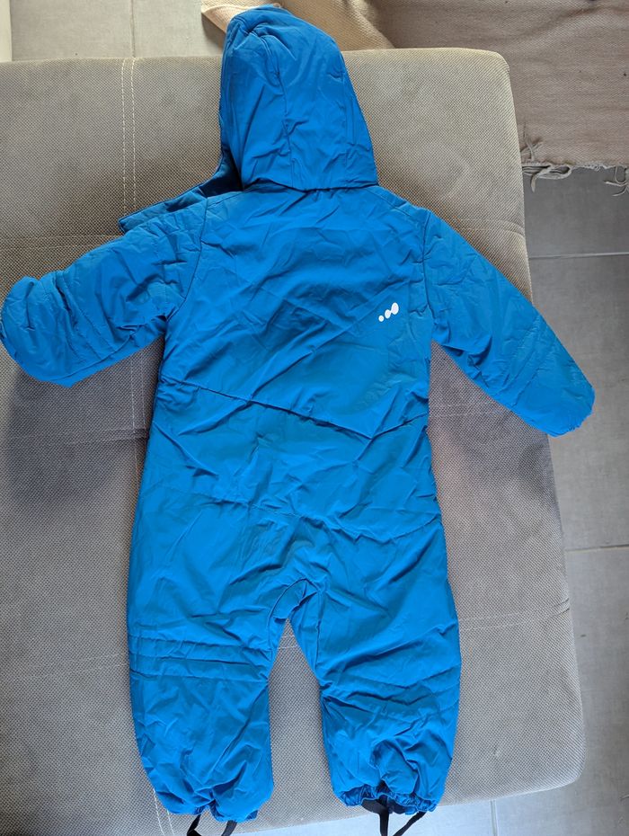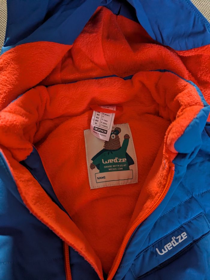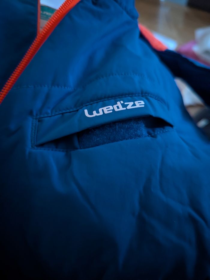 Combinaison de ski Decathlon, marque Wed'ze. Jolie couleur bleue et détails en orange fluo. Longueur de l'épaule jusqu'en bas (sans compter l'élastique du bas : environ 73 cm). Fermeture sur toute la longueur pour faciliter l'enfilage.
