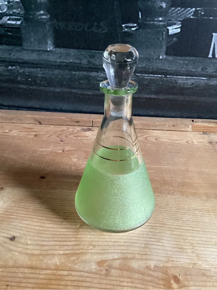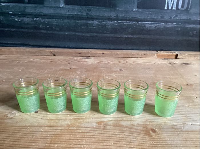 Carafe et 6 verres granités vintage 50-60 Hauteur de la carafe 20 cm Hauteur du verre 5 cm Traces d’usure d’usage C’est le bouchon d’une autre carafe