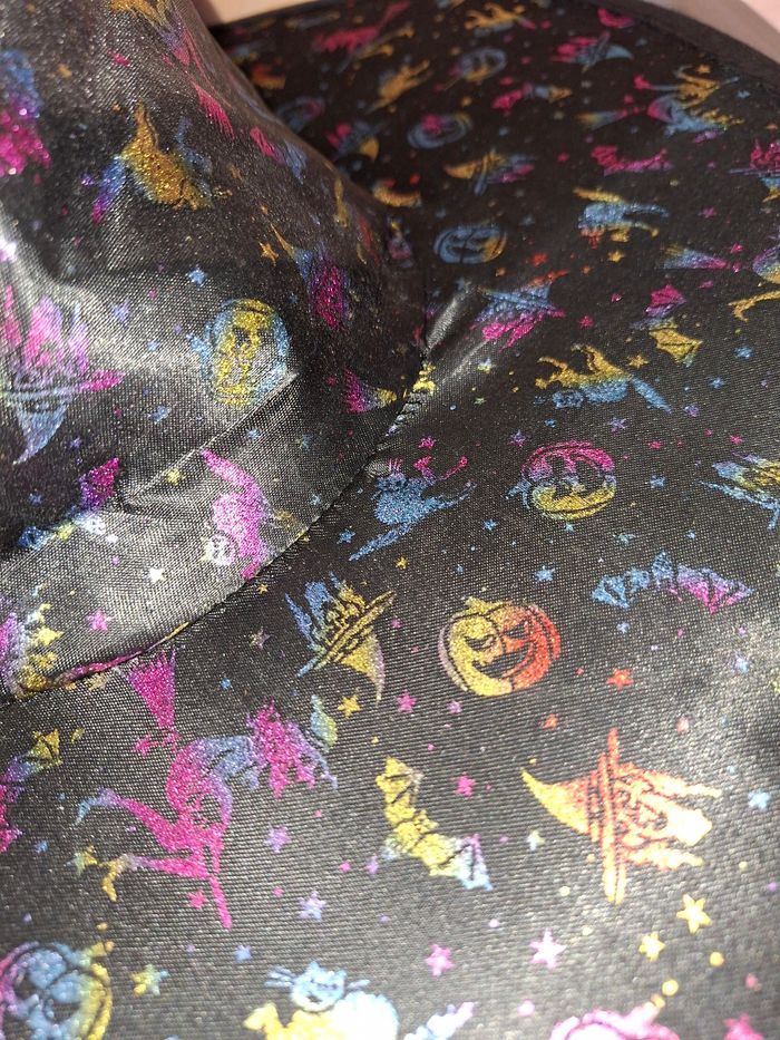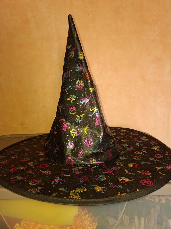 Complétez votre déguisement pour Halloween avec ce superbe chapeau de sorcière noir orné de motifs brillants et colorés (citrouilles, chats, chauves-souris, sorcières). ​L'article est en parfait état, les couleurs sont vives et le tissu a un bel aspect satiné. ​Dimensions précises : ​Hauteur : 44 cm ​Diamètre total (avec bords) : 45 cm ​Diamètre tour de tête : 19 cm (convient généralement pour un enfant ou un petit tour de tête adulte) ​Idéal pour une soirée déguisée, une fête d'école ou pour la décoration.