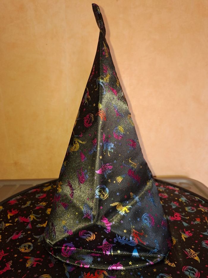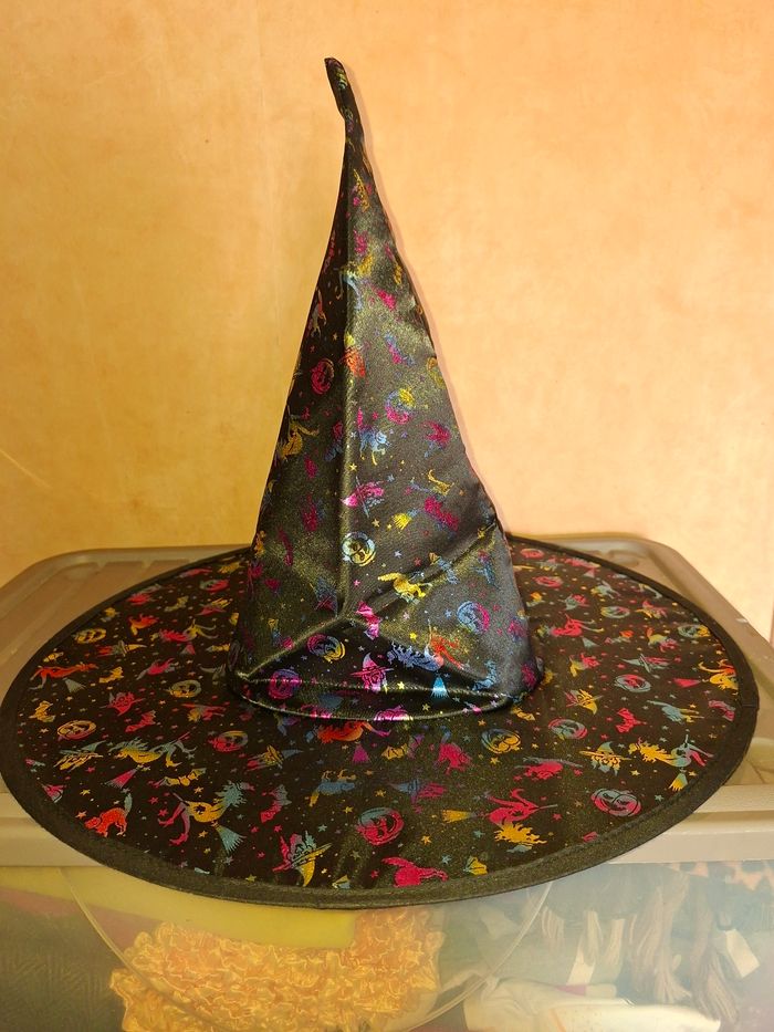 Complétez votre déguisement pour Halloween avec ce superbe chapeau de sorcière noir orné de motifs brillants et colorés (citrouilles, chats, chauves-souris, sorcières). ​L'article est en parfait état, les couleurs sont vives et le tissu a un bel aspect satiné. ​Dimensions précises : ​Hauteur : 44 cm ​Diamètre total (avec bords) : 45 cm ​Diamètre tour de tête : 19 cm (convient généralement pour un enfant ou un petit tour de tête adulte) ​Idéal pour une soirée déguisée, une fête d'école ou pour la décoration.
