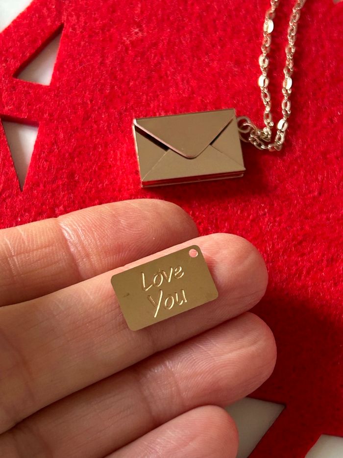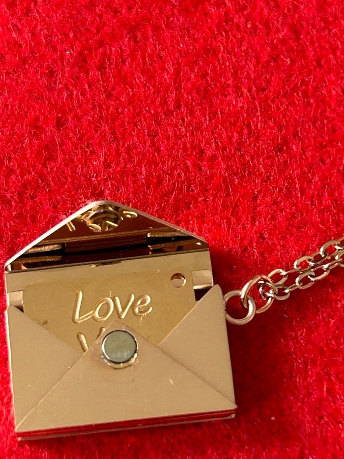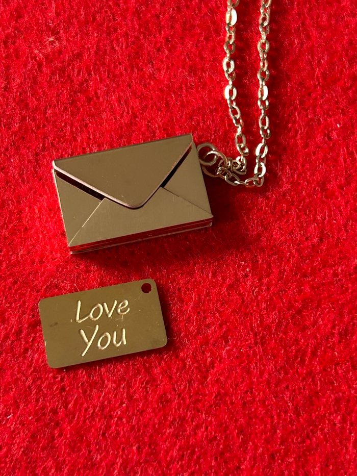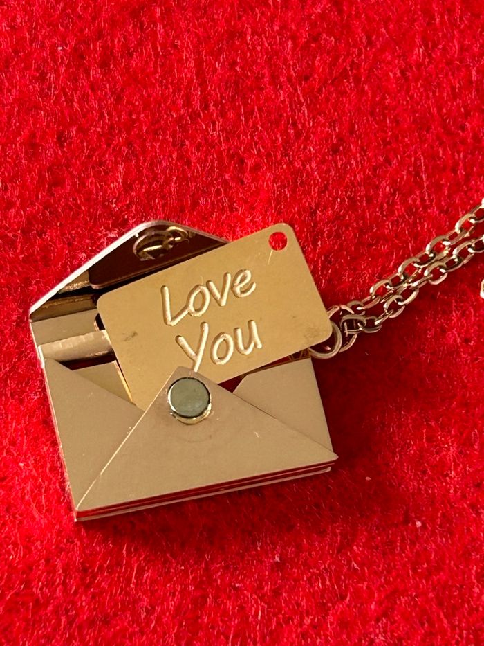Je vends un Collier/pendentif métal couleur or rose, en forme de petite enveloppe comportant une lettre avec le message. Love you Dites "Je t’aime" de façon surprenante ! Offrez à votre bien-aimé(é) un cadeau original et romantique pour la Saint-Valentin ! Ce magnifique collier de haute qualité , en acier, inoxydable, vous permet de lui déclarer votre amour de manière inédite , la petite plaque en forme de lettre comporte le message Love you , elle se glisse dans l’enveloppe qui se ferme grâce à un aimant. Caractéristiques du bijou : -Matériau : acier, inoxydable, polissage élevé couleur or rose -Dimensions de la chaîne :40 cm + 5 cm de chaînette - Dimensions du pendentif : 14 mm x 23 mm Bijou neuf , présenté dans une ravissante pochette en organza avec un petit cœur en satin Prêt à offrir pour la Saint-Valentin, ce collier fera fondre le cœur de votre partenaire Les origines de la Saint-Valentin célébrée le 14 février, cette fête, trouve ses racines dans la Rome antique. Au fil des siècles, cette journée est devenue une occasion de célébrer l'amour et l'affection, se transformant en une fête où les amoureux échangent des cartes, des fleurs et des cadeaux. Aujourd'hui, la Saint-Valentin est célébrée dans de nombreux pays à travers le monde, symbolisant l'amour sous toutes ses formes. ! Remise en mains propres à Chartres, secteur cathédrale ou envoi rapide et soigné Faites de cette Saint-Valentin un moment inoubliable avec ce bijou unique !