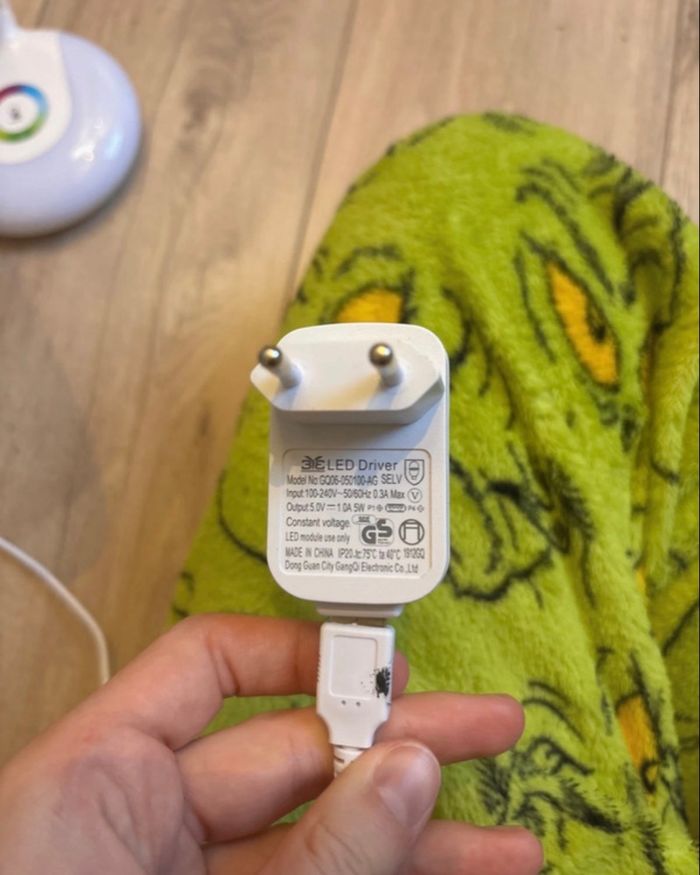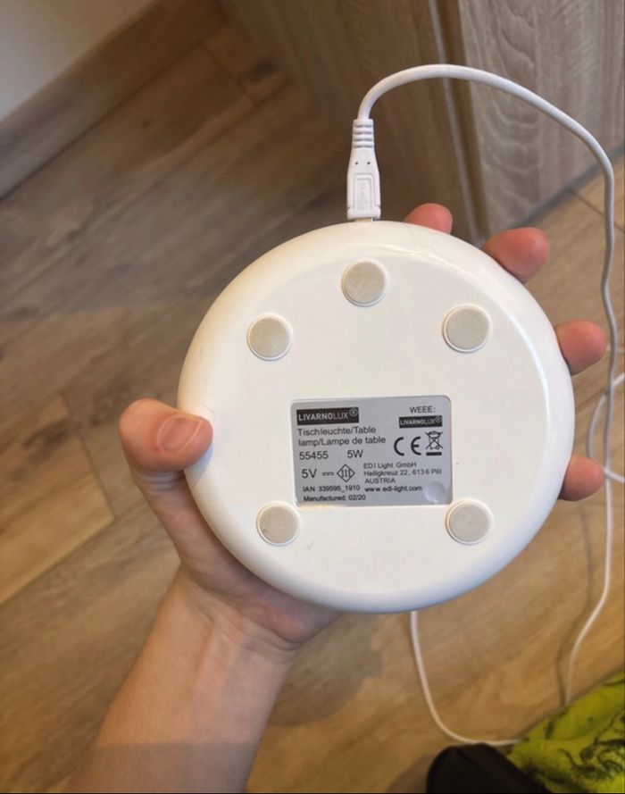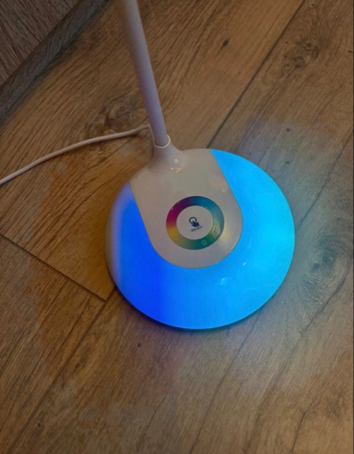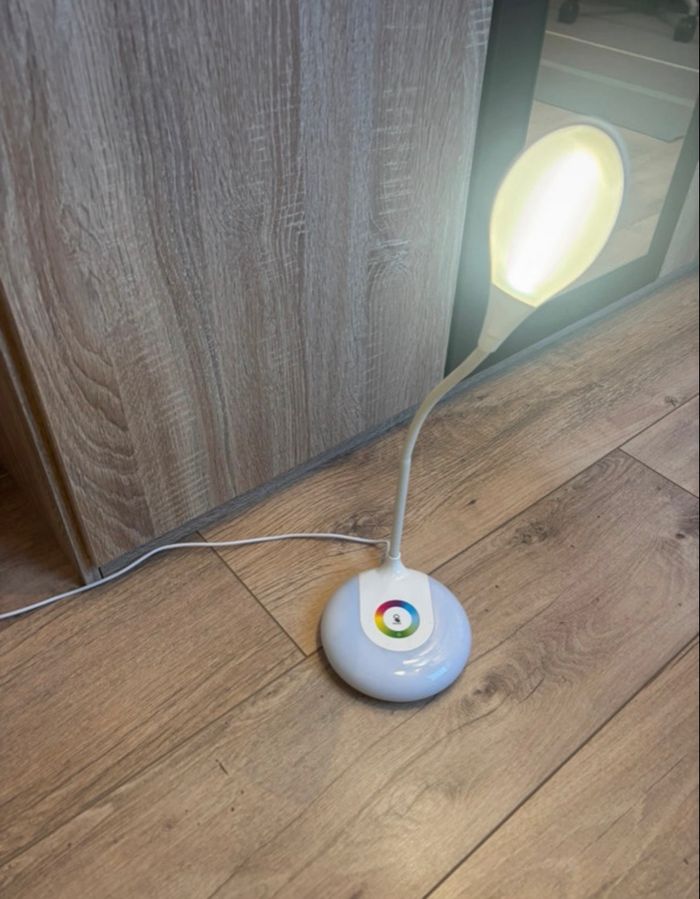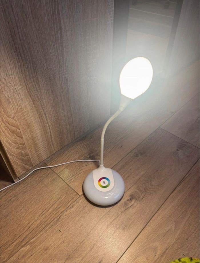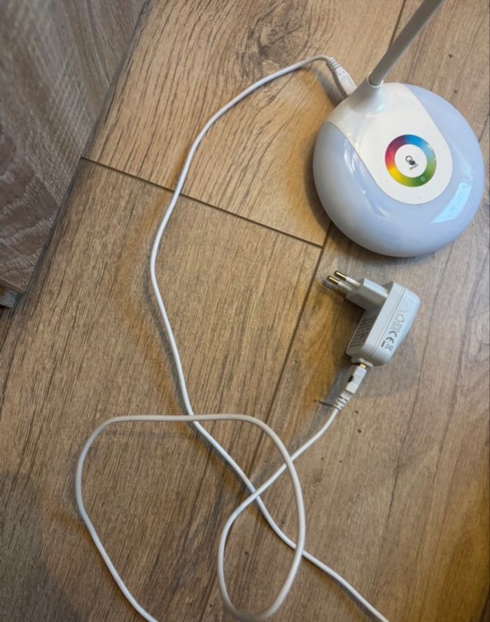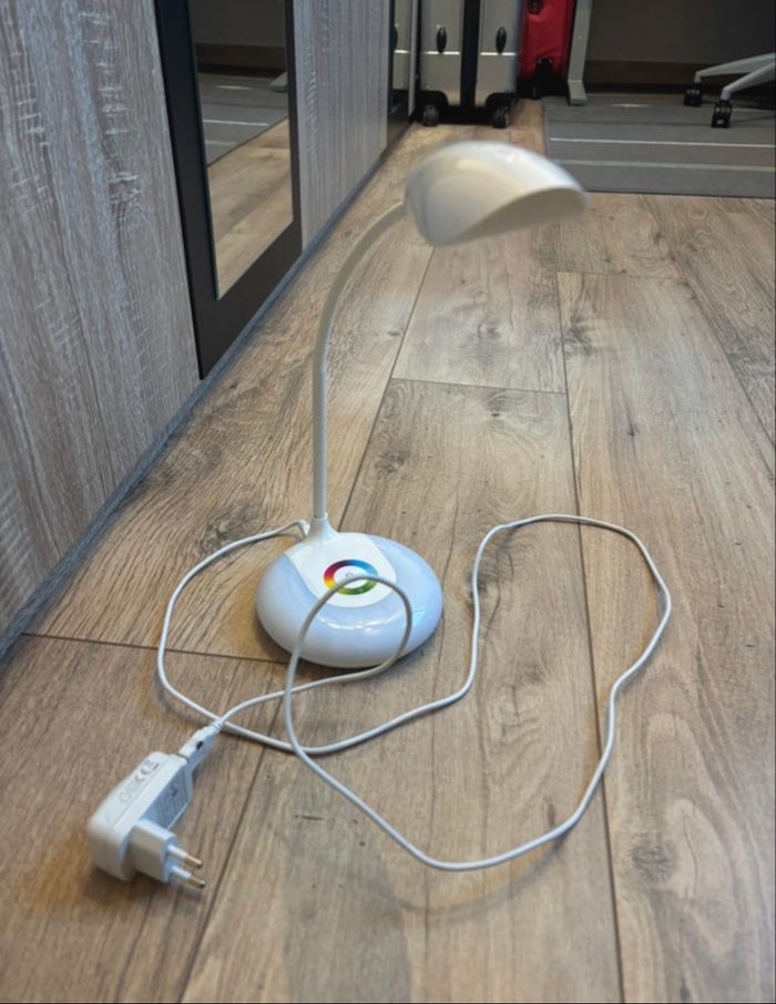 lampe de bureau 3 intensité de couleur on peut aussi mettre plusieurs couleurs sur le plateau elle est en parfait état le trais noir sur le chargeur est une tache de peinture