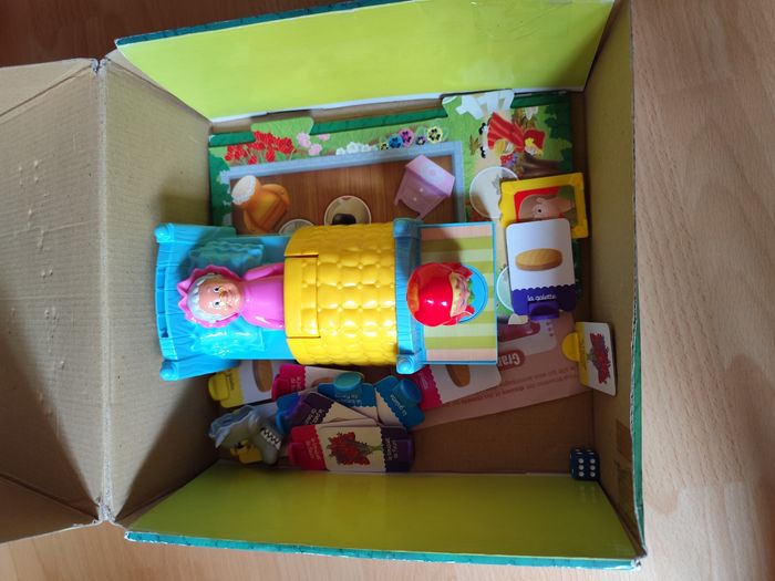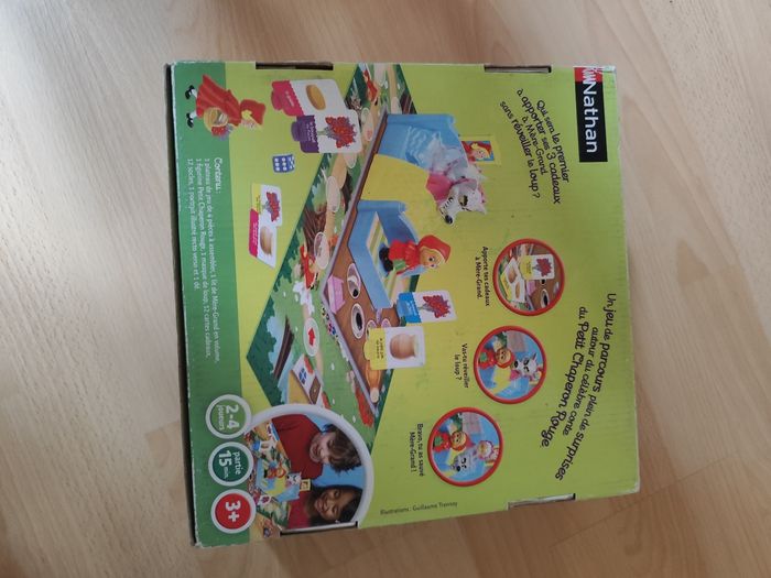 Un jeu de société sur le thème du petit Chaperon Rouge. Chaque joueur doit apporter des cadeaux à une drôle de grand-mère : Mère-Grand, que tu as de grandes dents ! Mais attention à ne pas réveiller le loup ! Contenu : - 1 plateau de jeu de 4 pièces à assembler, - 1 lit de Mère-Grand en volume, - 1 figurine petit Chaperon Rouge, - 1 masque de Loup, - 12 cartes cadeaux, - 12 socles, - 1 portrait, - 1 dé.