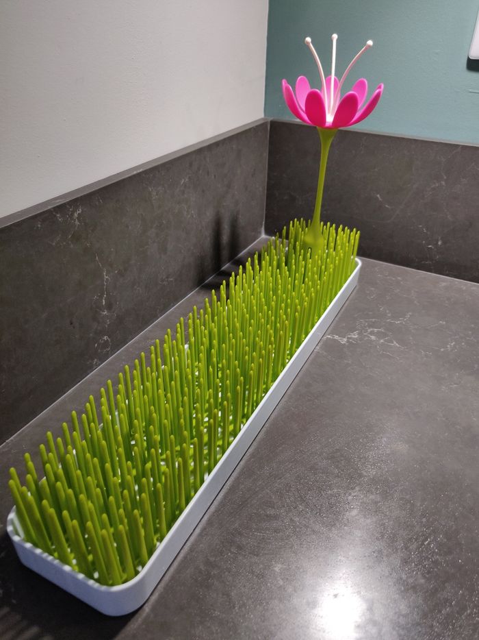 Cet égouttoir pratique est parfait pour les petits espaces grâce à ses petites dimensions. Il sert pour le séchage des différents articles de nourriture des bébés. Les petits objets se reposent dans l'herbe alors que l'eau coule dans le petit bac de réception en dessous. Parfait pour les biberons et les tétines ! Facilement lavables Peut être lavé au lave-vaisselle Dimensions: 8,9 x 43,8 x 7,6 cm
