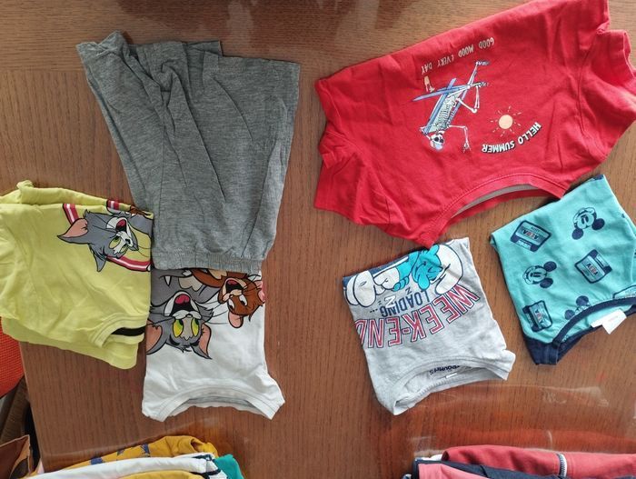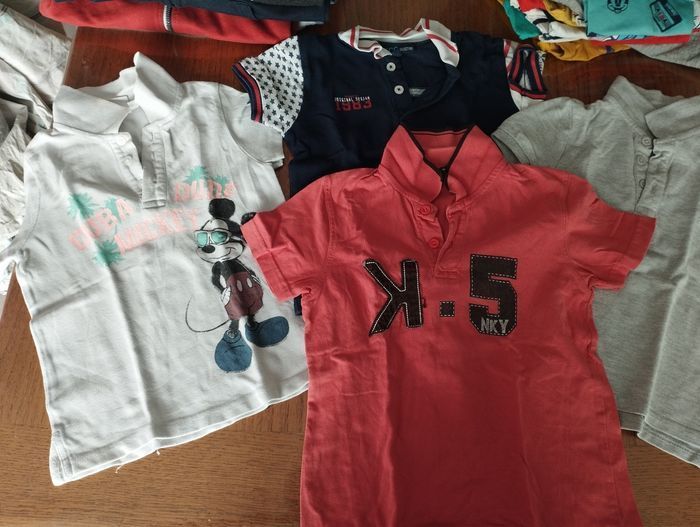 Lot vêtements garçon 4 ans printemps été Trois gilets, un pull à manches longues et un peu la manche courte 4 polo dont un légèrement taché sous le col voir photo Trois pantalons qui ont bien vécu à petit prix Trois shorts Un pyjama short et un t-shirt de pyjama Tom et Jerry Trois t-shirt Deux débardeurs et 5 t-shirt à manches longues Multimarque Le tout a été porté mais peut-être encore utilisé.