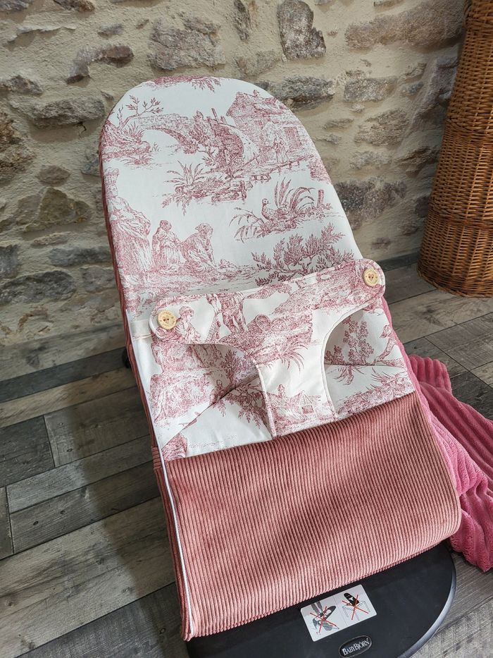 Housse transat babybjorn ●couverture amovible adaptée et assortie. Elle remplace totalement celle d'origine. Toile de jouy / rose.