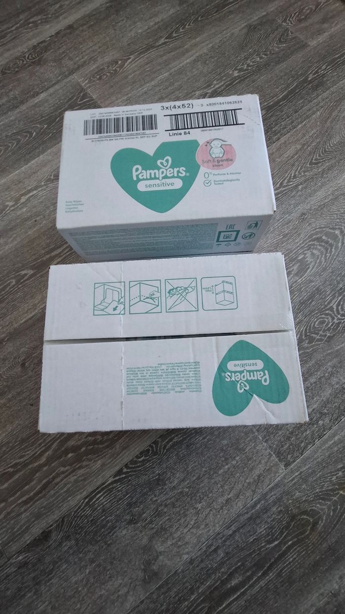 Je vends un Lot de deux grand cartons de lingettes pampers sensitive