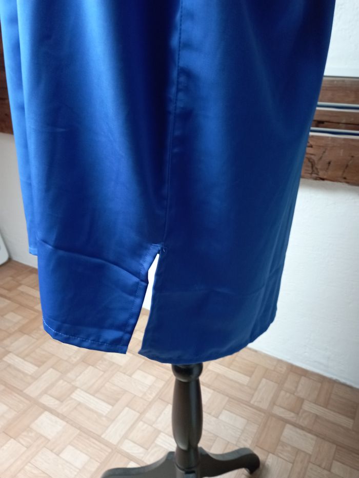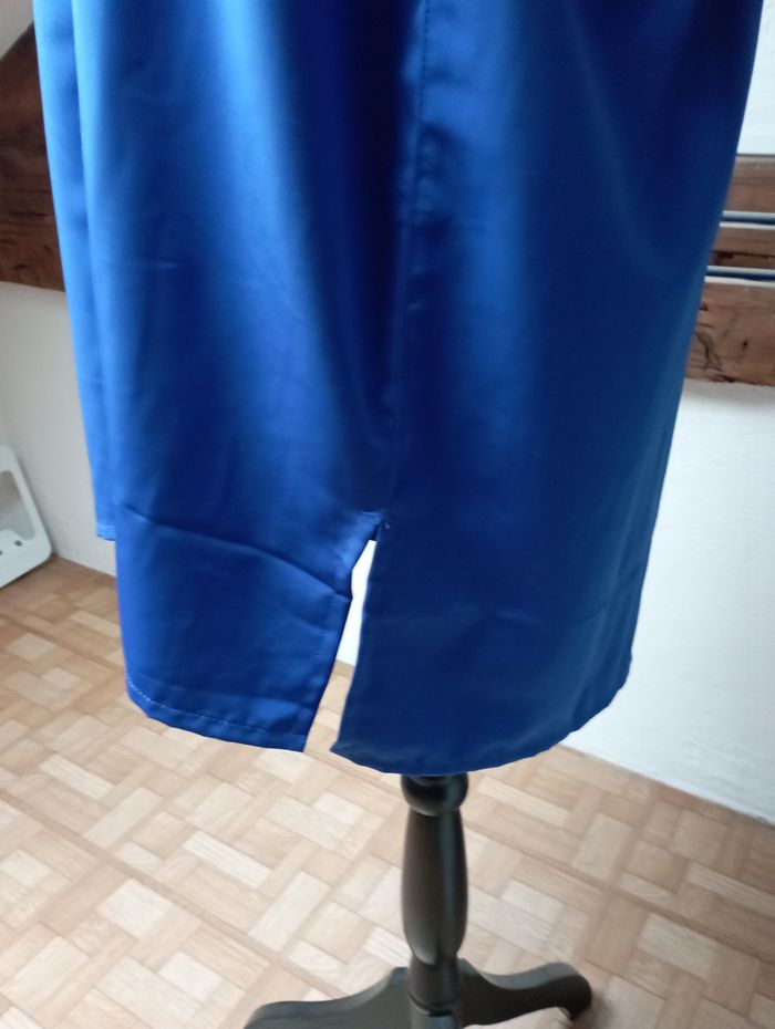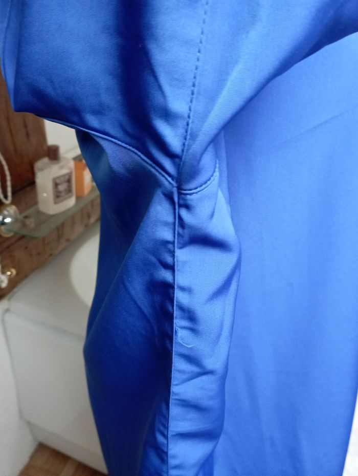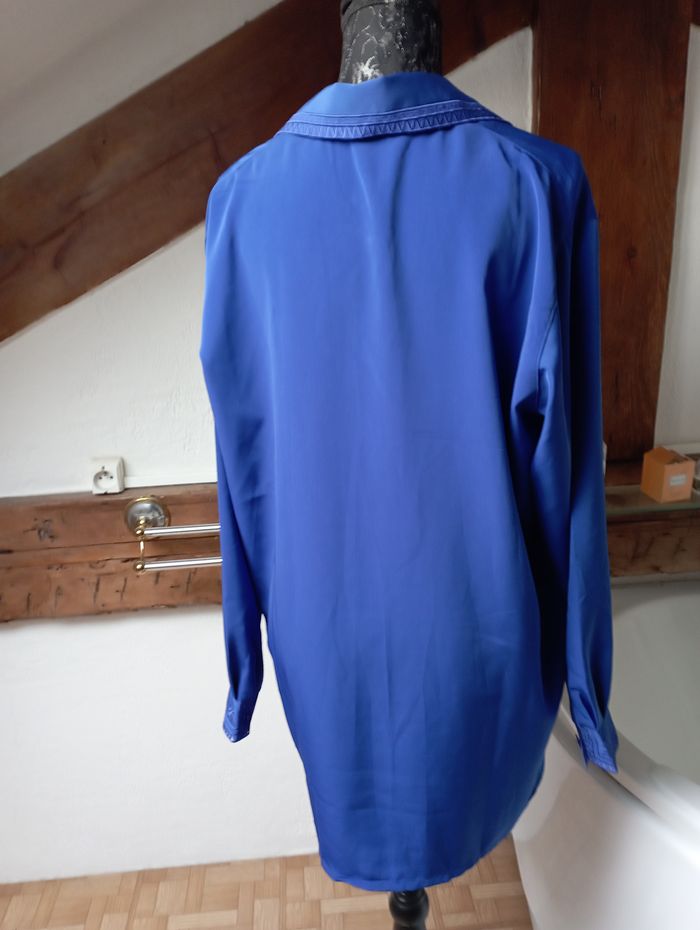 chemise bleue avec des manches longues fendue sur les côtés, en bas je n'ai pas trouvé de marque taille 48 100 % polyester en très bon état pour plus de renseignements, n'hésitez pas à me faire un message j'étudierai toute proposition que vous me feriez