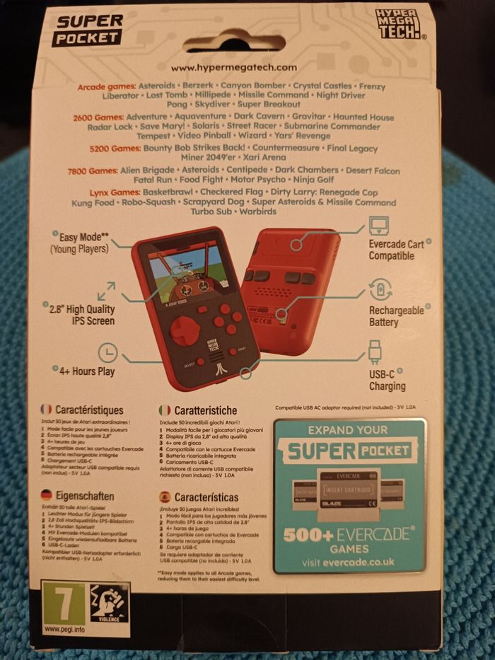 Console Rétrogaming - JUST FOR GAMES - Atari Super Pocket. Neuve dans sa boîte d'origine jamais ouverte. Contient 50 jeux Atari classiques. Mode facile pour les jeunes joueurs . Écran IPS haute qualité 2,8''. +4 heures de jeu . Compatible avec les cartouches Evercade. Batterie rechargeable intégrée. Chargement USB-C. Adaptateur secteur USB compatible requis, non inclus - 5v 1.0A. Envoi soigné sous bulles.