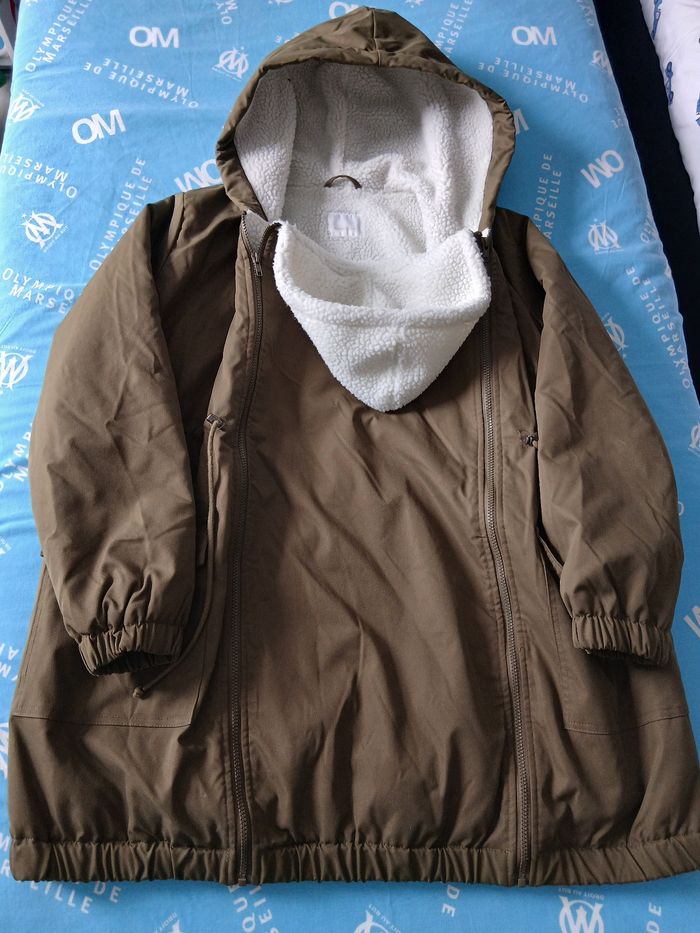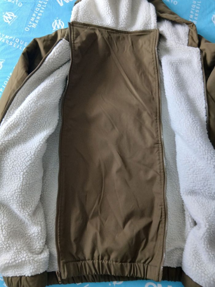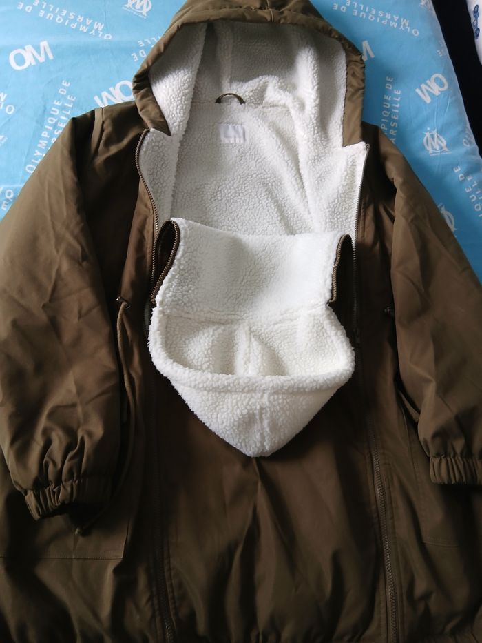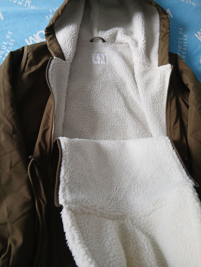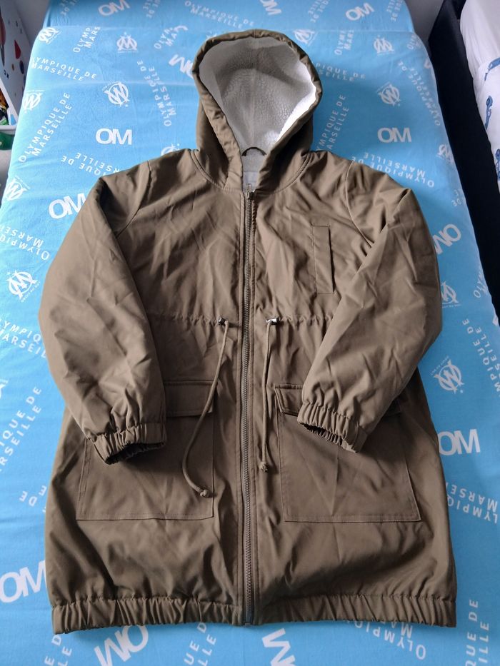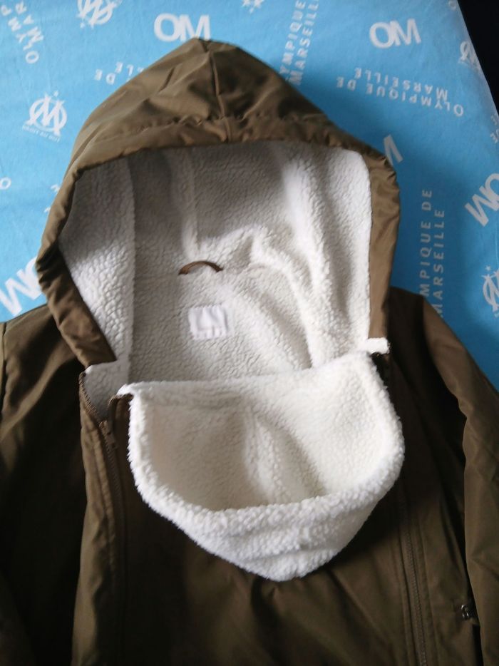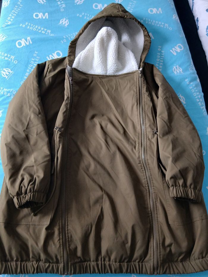 1 parka 3 en 1 comme neuve Elle peut se porter pendant la grossesse , à la naissance de bébé ajustement à la taille Et peut se porter par la suite en retirer la partie du milieu Taille L couleur kaki
