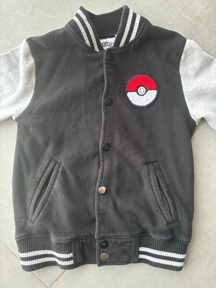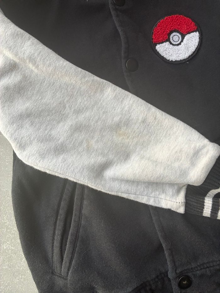Veste teddy Pokémon. Tachées sur les manches et la peinture sur deux boutons a sautée.