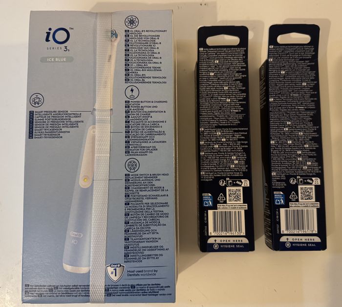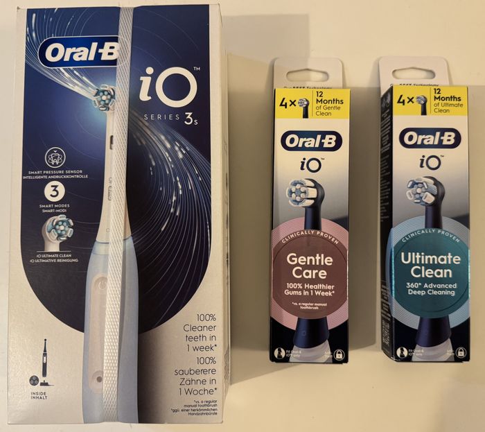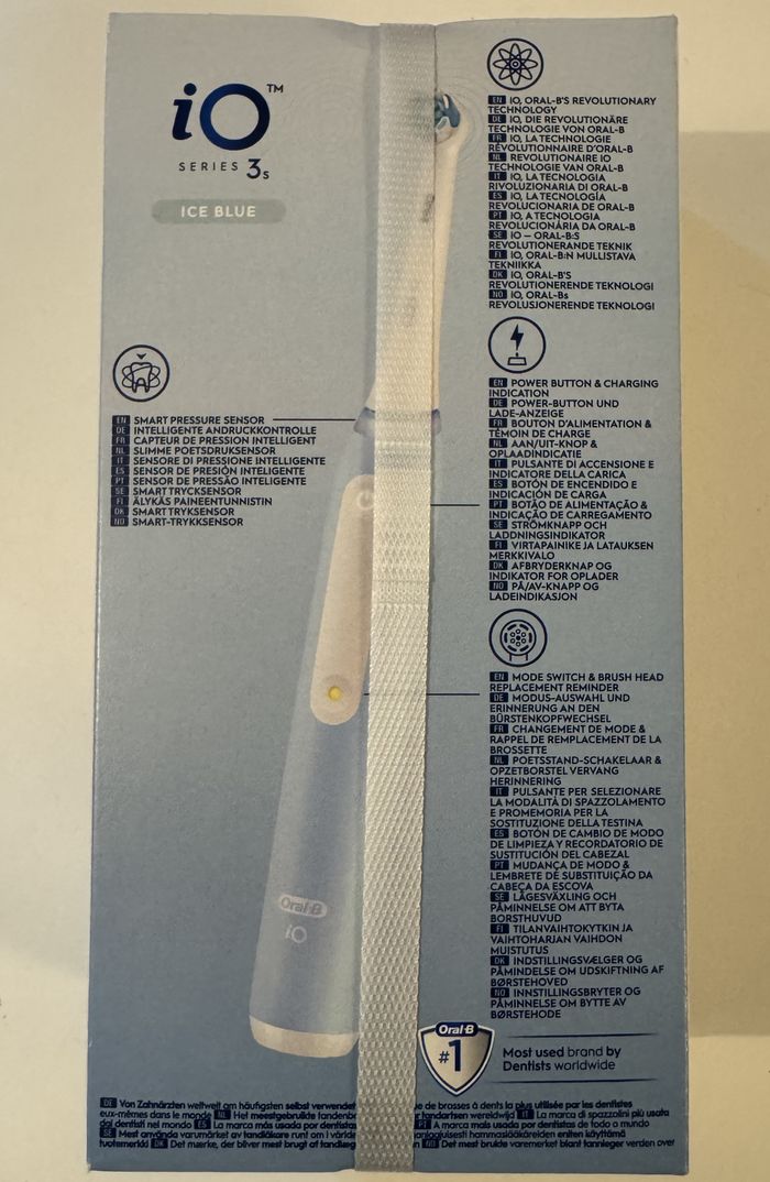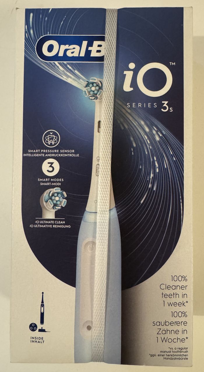 ► 1 brosse a dents électriques _Oral-B IO 3S Toothbrush Blue. ► 1 Oral-B Set of 4 Replacement Brush Heads Gentle Care Genuine Black Softest Brush Suitable for Sensitive Gums Round Brush for Oral B iO Electric Toothbrushes. ► 1 Oral-B Ultimate Clean Genuine Black Replacement Brushes Set of 4 Deep Brushing Dental Plaque Removal Round Brush for Oral B iO Electric Brushes. - Type de produit : Brosse à dents électrique - Marque : Braun - Modèle : Oral-B IO 3S - Couleur : Bleu - Technologie : Capteur de pression intelligent, Modes de brossage intelligents - Accessoires inclus : Chargeur État neuf Produits neufs dans leur emballage d'origine scellé, jamais ouverts.