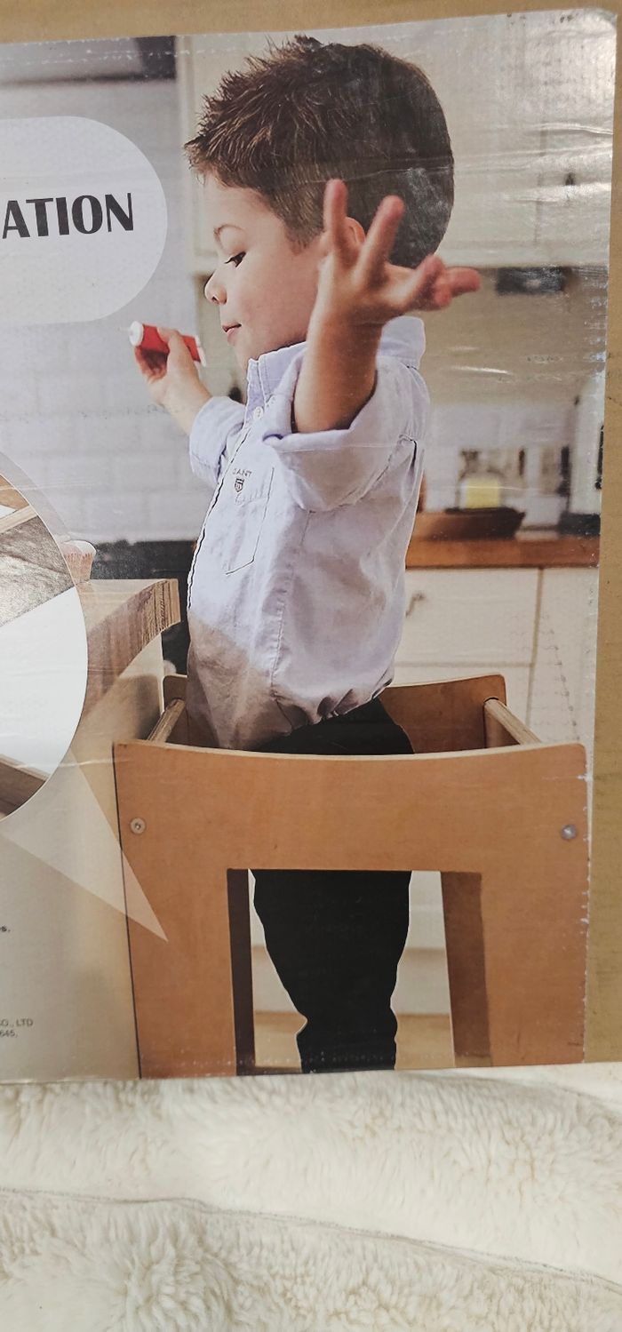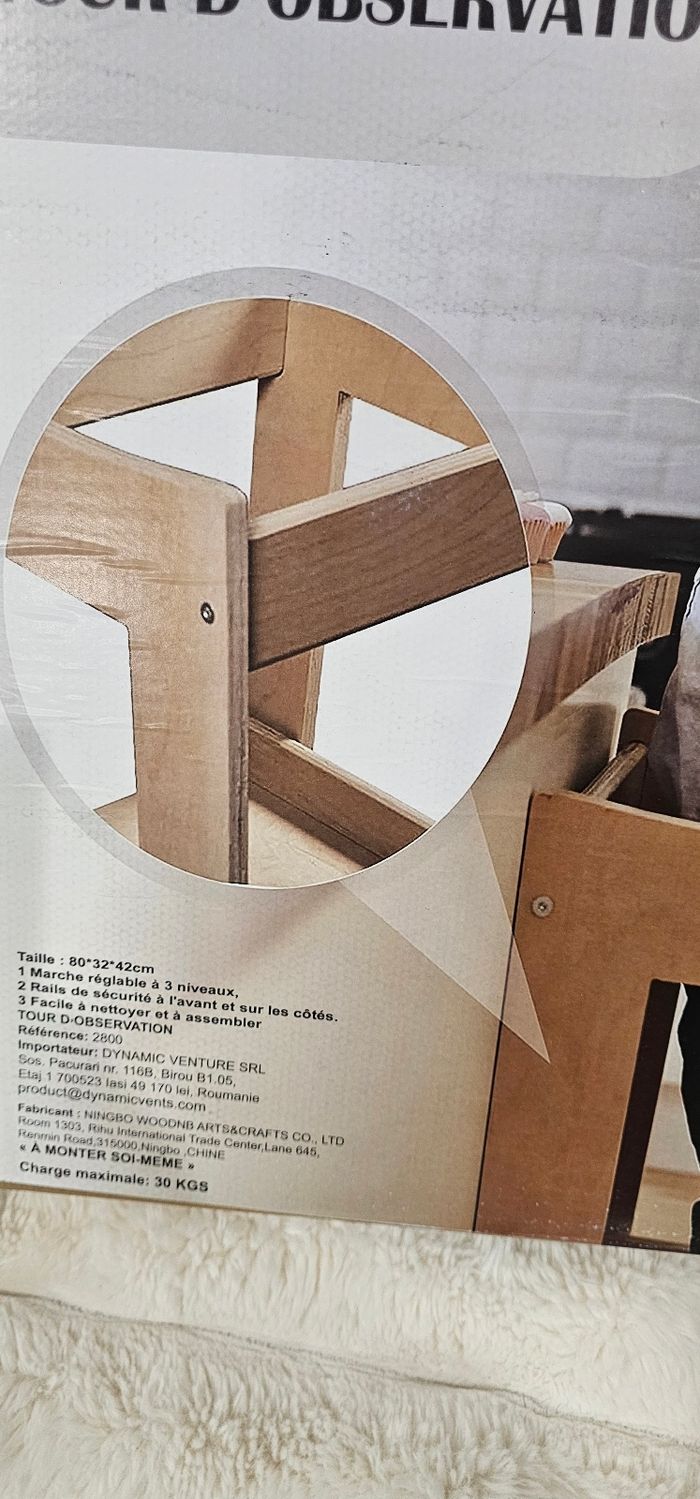 ☆ Tour d observation enfant en bois . ☆ Marche réglable a 3 niveaux. ☆ Rails de sécurité à l'avant et sur les côtés. ☆ Facile à nettoyer ☆ Support de charge 30 kg. ☆ Dimension : 80x32x42 cm A monter soi même. Neuf.