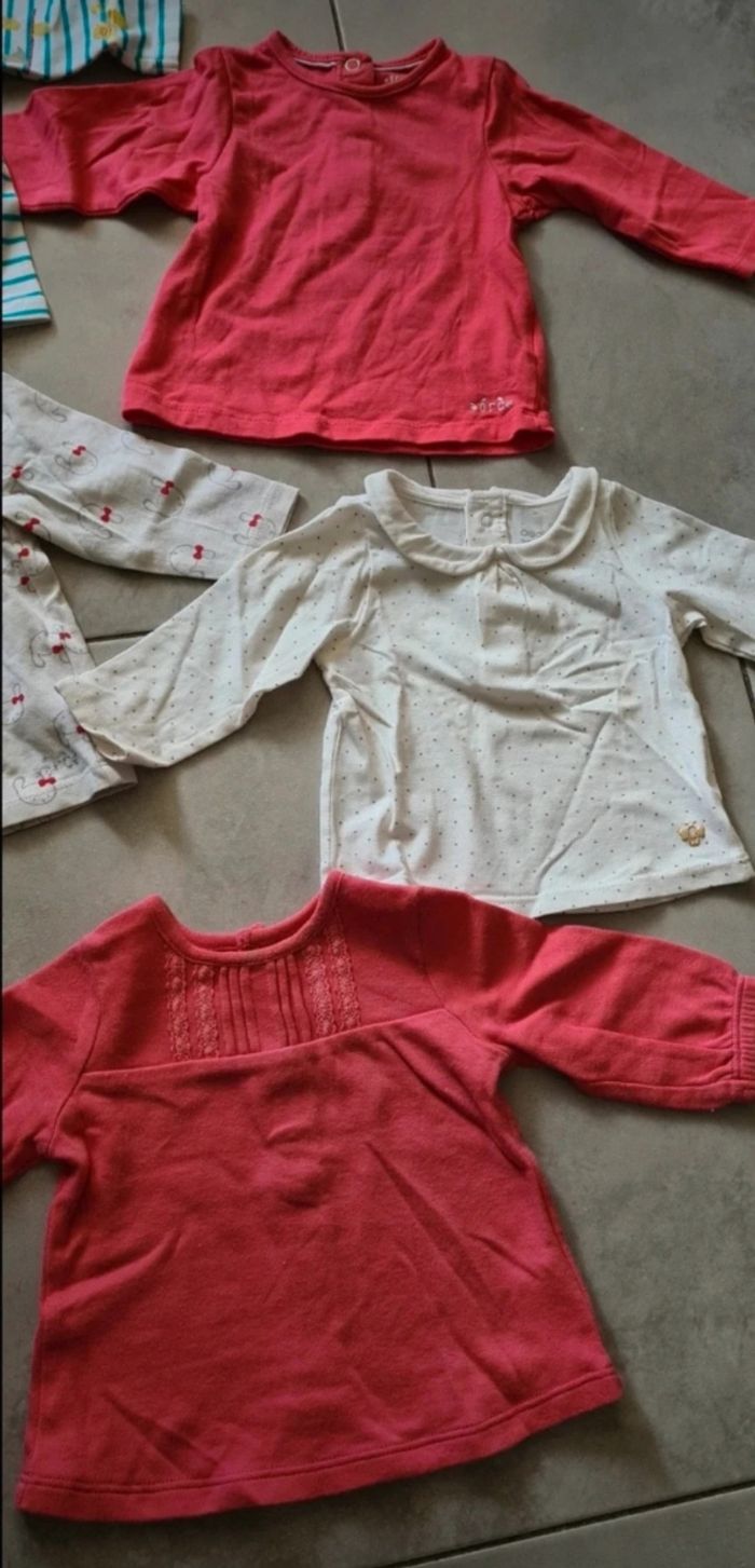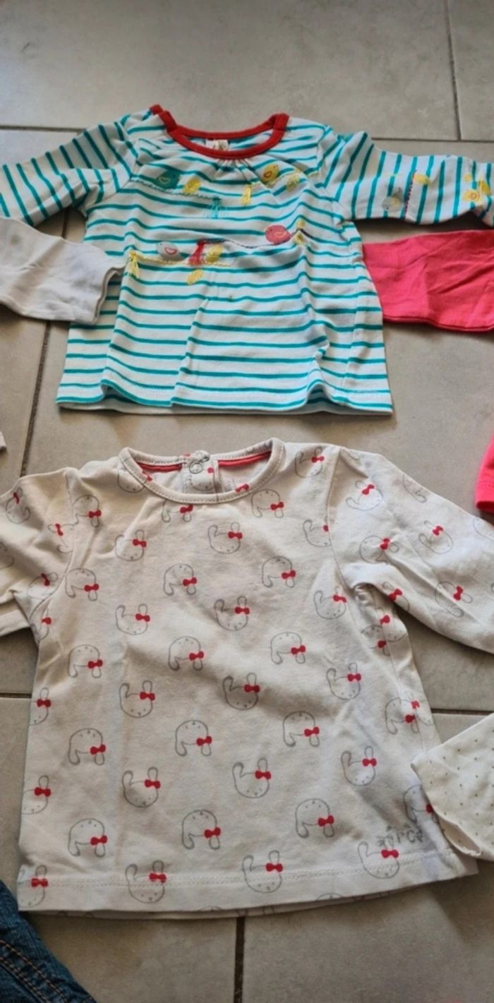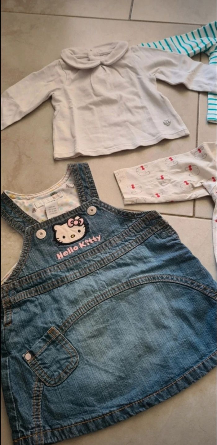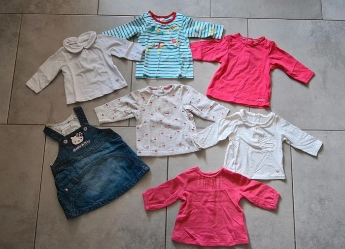 Lot de 6 tee-shirts manches longues filles + 1 robe en jean hello kitty taille 3 mois. Le tee-shirt a rayures présente une tâche (je le donne). Le reste est en très bon état. Principalement du orchestra.