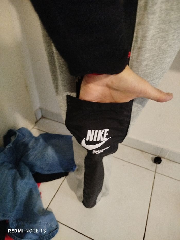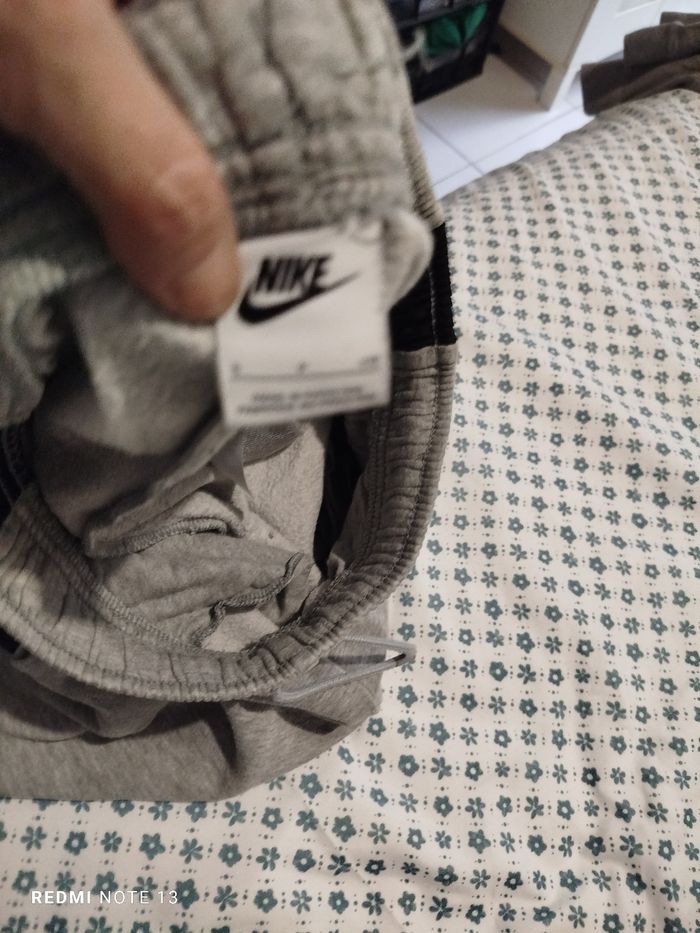 #kytieShomme. Jogging taille S de marque Nike taille élastique avec cordon gris et noir molletonné avec une poche tissus imperméable sur la cuisse gauche mesure de la taille 36 cm élastique tiré au max 44 cm tour de cuisse 75 cm hauteur 95 cm Chevilly élastique de 30 cm poche avant deux matières la deuxième matière est un effet k-way ref SN