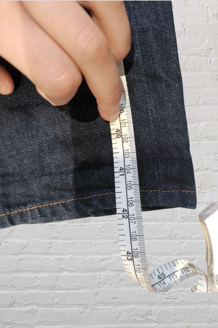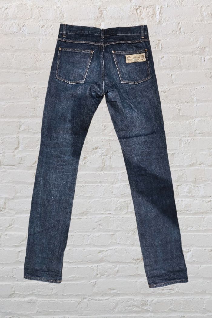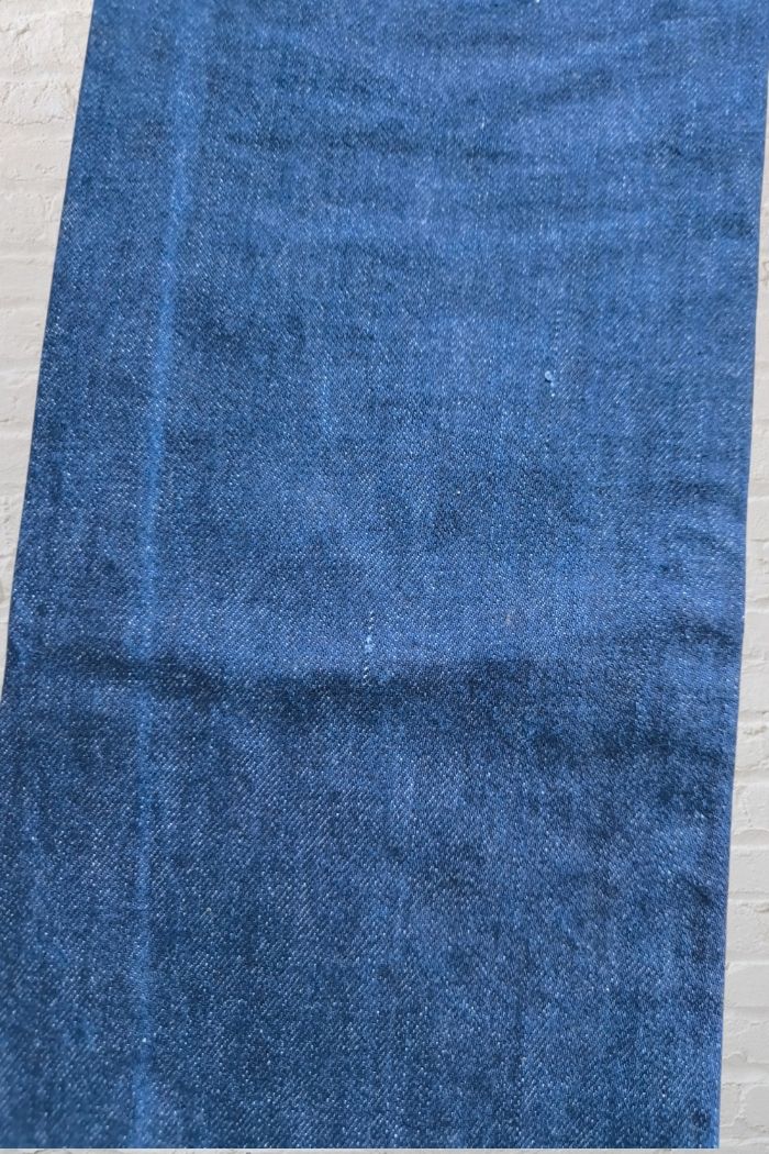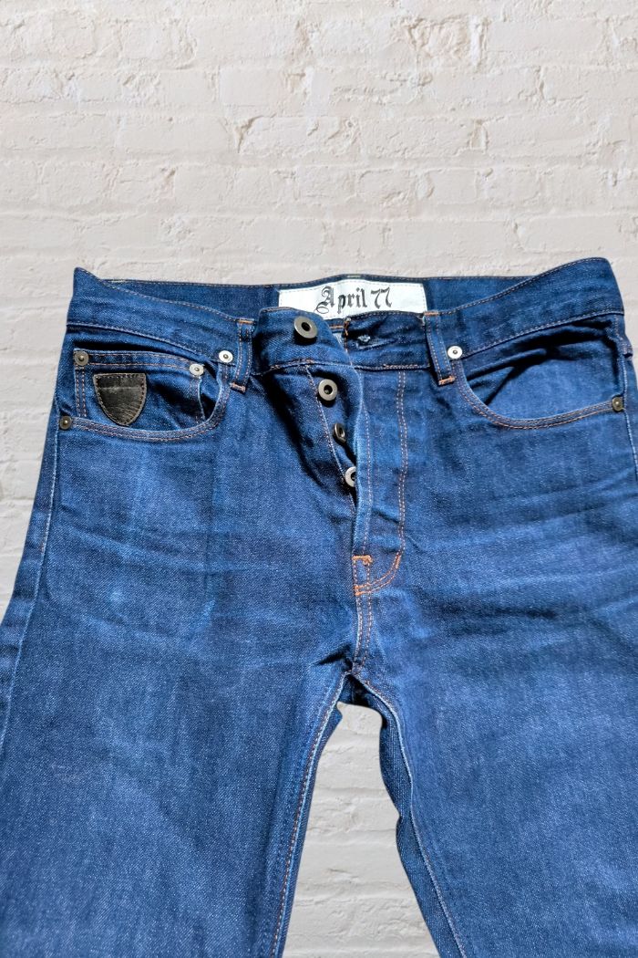 Jean bleu marine brut de la marque April 77, vintage Vibrator Raw, taille US 28 A deux petits accros à l'arrière du mollet gauche Marque de délavages poche droite et une jambe Taille ceinture 38 cm Longueur 98 cm 100% coton
