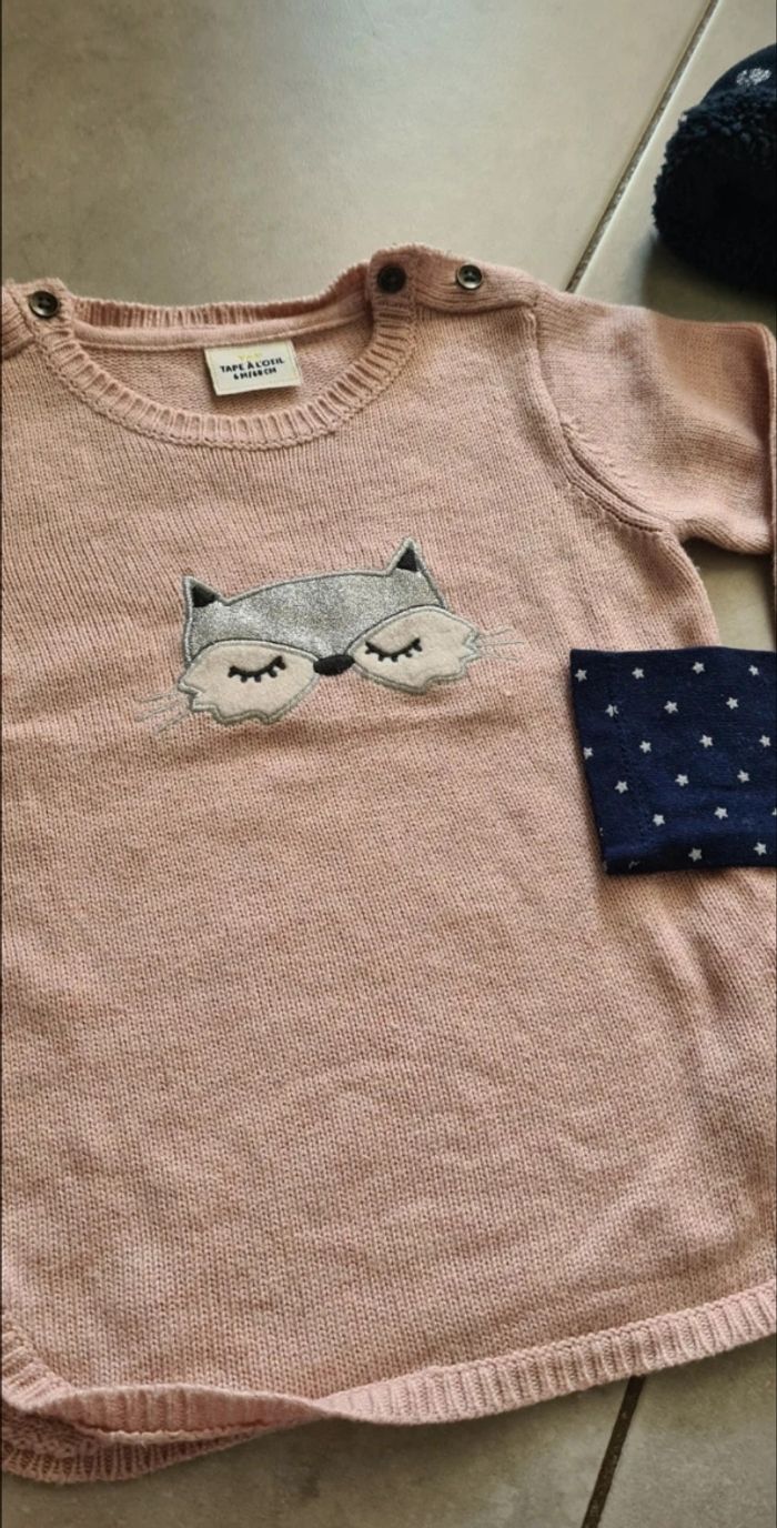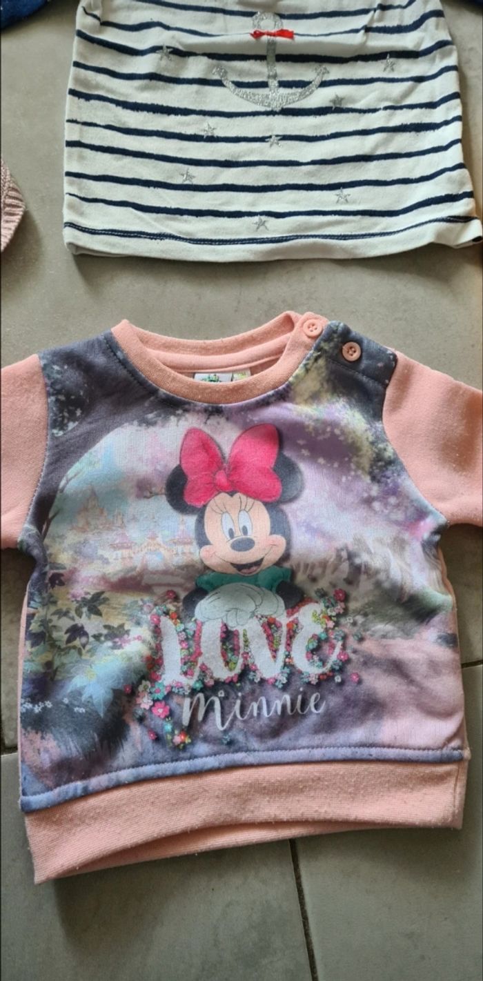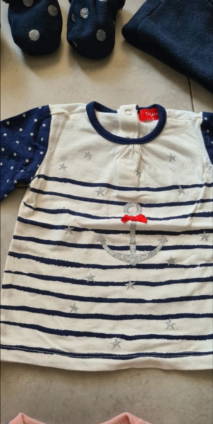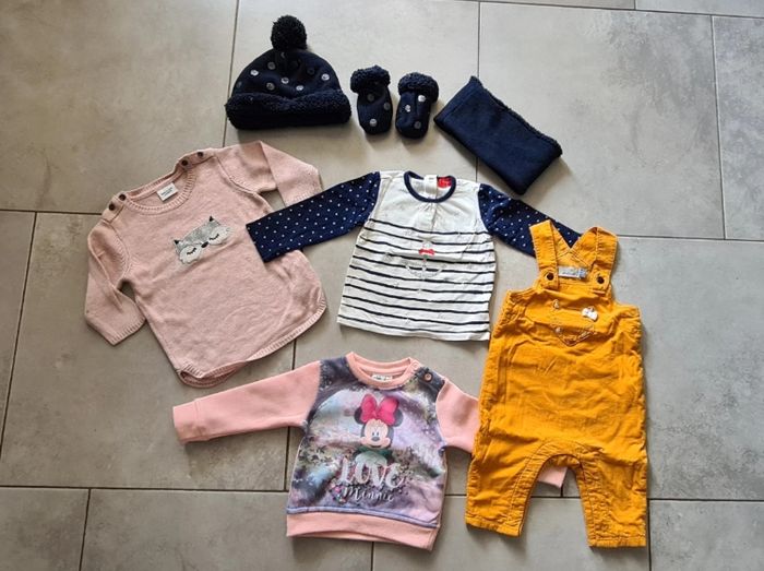 Lot comprenant 1 salopette, 1 robe, 1 tee-shirt manches longues (que j'assemblais avec la salopette), 1 sweat Minie (il bouloche un peu je le donne) ainsi qu'un ensemble bonnet, gants, tour de cou. Taille 6 mois. Tres bon état Différentes marques orchestra, kiabi, tisaia, tape à l'œil