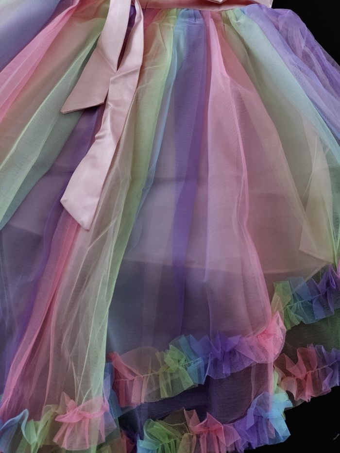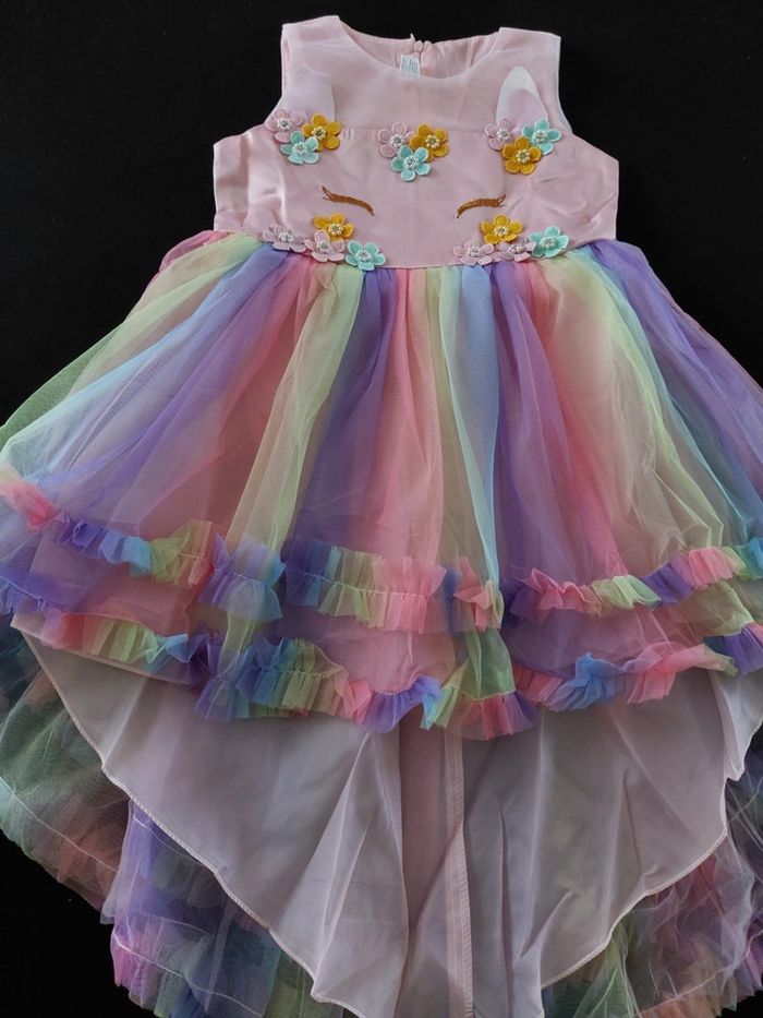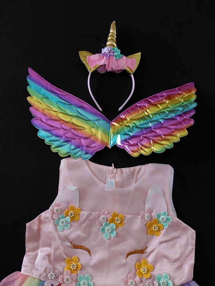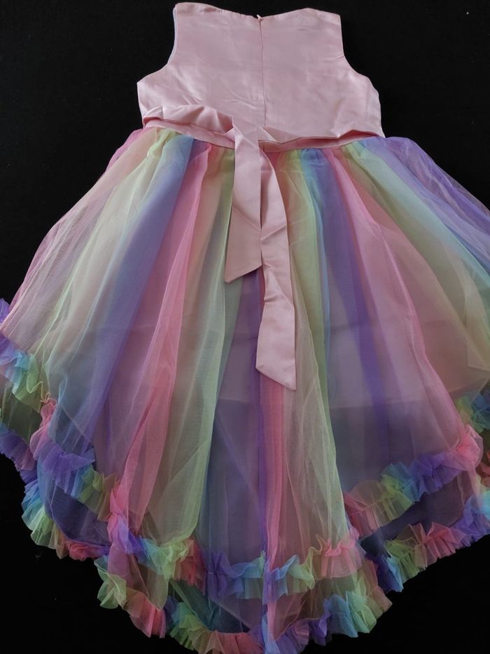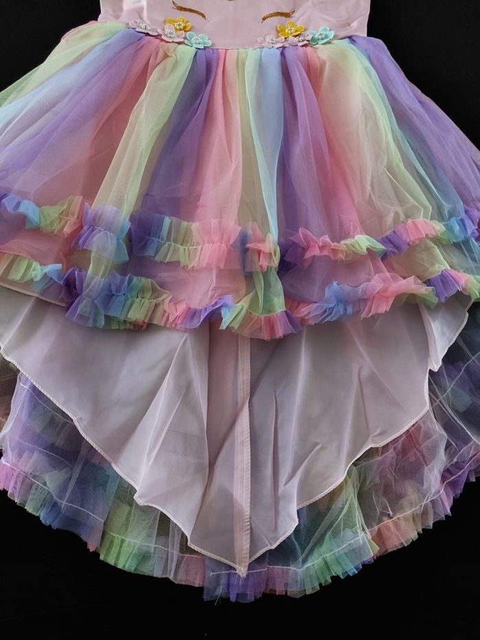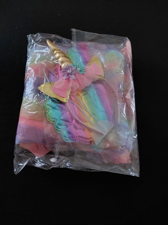 Déguisement robe princesse licorne multicolores et ces accessoires (ailes et serre tête). La robe mesure 60cm de longueur sur l’avant et 80cm de longueur sur l’arrière, la taille convient aux petites filles de 6-7ans. Totalement neuve, vendue dans son emballage d’origine. Expédition rapide après votre commande