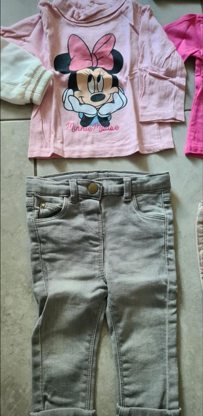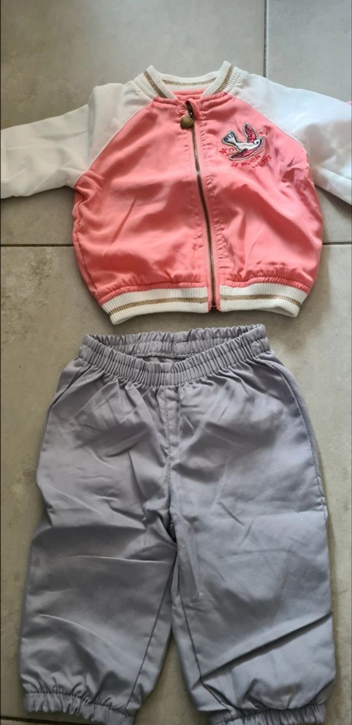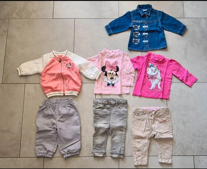 Lot fille comprenant 3 pantalons (dont 1 jogging) + 2 tee-shirts manches + 1 veste de jogging (qui va avec la veste) + 1 veste imitation jean. Très bon état taille 6 mois