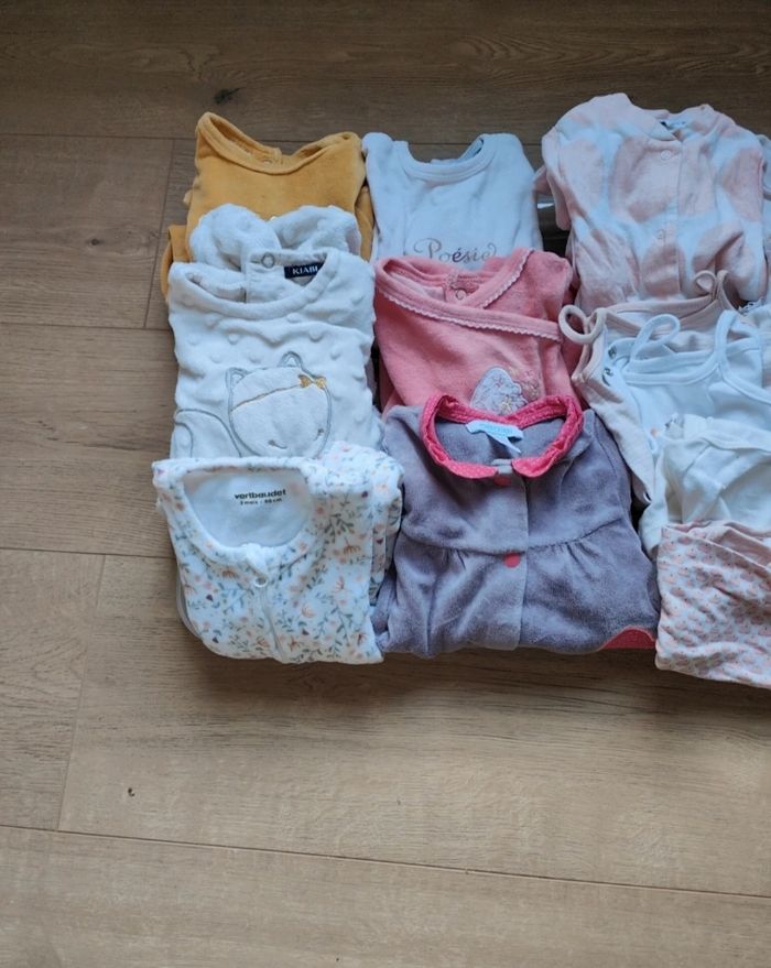 Vend un lot de pyjamas et body manches longues et courtes fille taille 3 mois. De différentes marques.