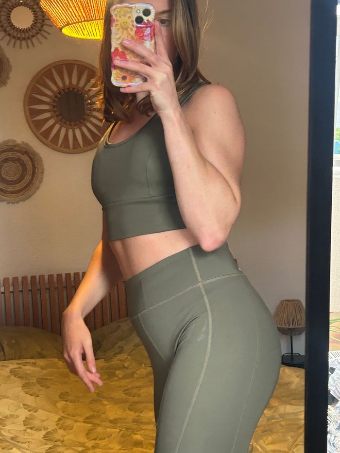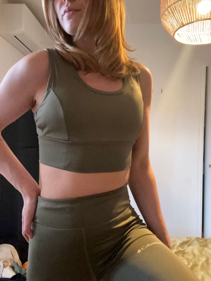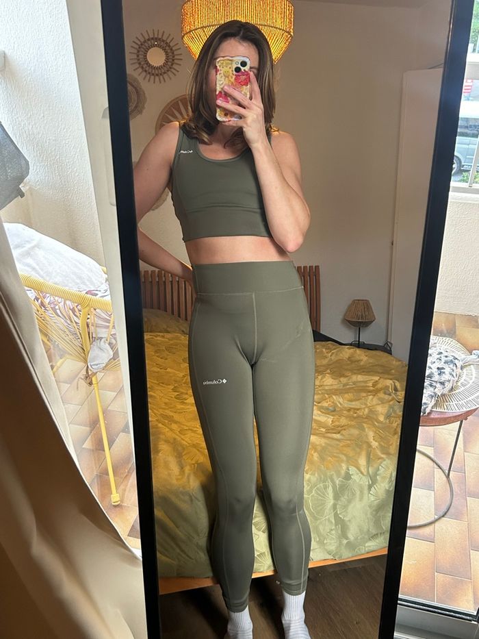 🔹 Haut (brassière) • Coupe crop avec encolure arrondie • Maintien confortable, idéal pour le sport doux à modéré (yoga, fitness, marche, quotidien) • Matière stretch et respirante, agréable à porter • Logo Columbia discret sur la poitrine • Très facile à associer avec d’autres bas de sport ou à porter en ensemble 🔹 Bas (legging – détails importants) • Taille haute gainante, qui maintient bien le ventre et affine la silhouette • Coupe près du corps, effet seconde peau • Matière extensible, douce et non transparente • Coutures plates pour un confort optimal et éviter les frottements • Logo Columbia discret sur la cuisse • Longueur cheville, idéale pour toutes saisons • Parfait pour le sport comme pour un look athleisure au quotidien ✨ Couleur : vert kaki / olive ✨ Taille : S Légères imperfections sur le bas