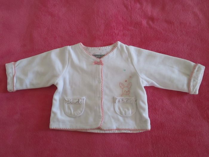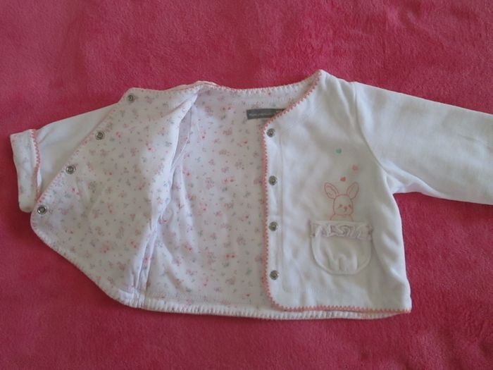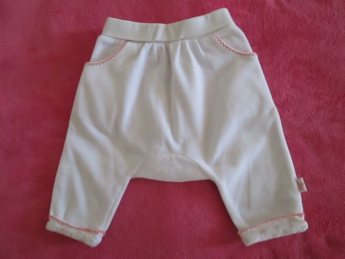 Vends ensemble mon 1er Major en velours blanc. - Haut avec petites poches fantaisies, broderie, petit nœud et surpiqure rose. Doublé fleuri assorti au bas du pantalon. - Pantalon élastiqué à la taille, surpiqures aux poches et sur le revers fleuri. Taille 6 mois. Comme neuf. Pour plus de choix, allez consulter mes autres annonces.
