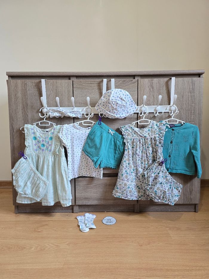 Lien direct vers les tailles équivalentes dans mon dressing : #fdhsarah24mois #fdhsarahSGMJ 📜 Lot comprenant : - Robe imprimée fleuri mauve, lilas, vert turquoise et noisette sur fond écru. Détails ajourés sur buste et bas de robe. Accompagnée de son bloomer. Ref : MAPAULINE - Gilet/cardigan ajouré fleurs couleur vert turquoise. Ref : MAPRUNE - Ensemble : Tshirt à l’imprimé fleuri mauve et vert sur fond écru. Short vert turquoise avec volants sur bas des cuisses et bandeau pour les cheveux. Ref : MAPAULA - Bob imprimé fleurs violettes sur fond écru T3 48 cm Ref : MAPETULA - Chaussettes taille 19-22 Ref : MAPOMME - Robe rayée scintillante avec broderies de fleurs violettes sur bas de robe. Smocks sur buste avec volants. Accompagnée son bloomer. Ref : MAPATRICIA Collection : Vert de Tilleuil Taille 📏 : 24 mois / 86 cm État 🔍 : Très bon état Marque 🏷️ : Sergent Major Je suis disponible pour toutes questions ou photos supplémentaires. 📦 L’envoi se fait le plus rapidement possible Bon Shopping #fdhxxx24xxx