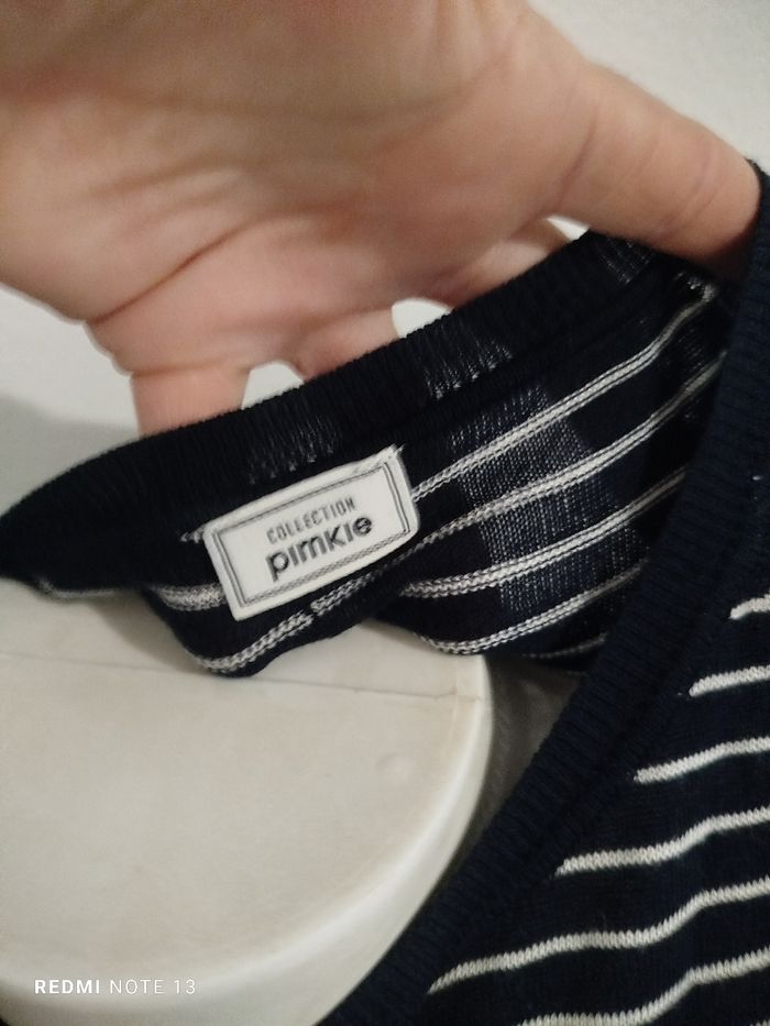 #kytieMfemme. Marinière taille M de marque Pimkie marine et blanche élastique col rond 50 % acrylique 50 % viscose mesure des épaules à 36 cm mesure des aisselles 50 cm hauteur 60 cm P14