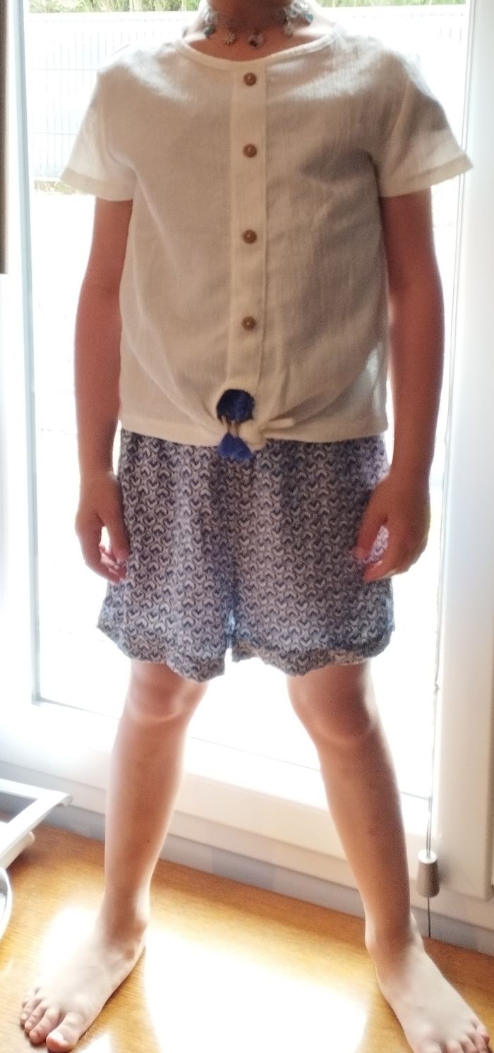 Ensemble fille 6 ans, été, marque Gémo, combishort style débardeur fluide couleur blanc et bleu. Qui fait habillé avec son haut couleur crème finition nœud en bas. Très bon état