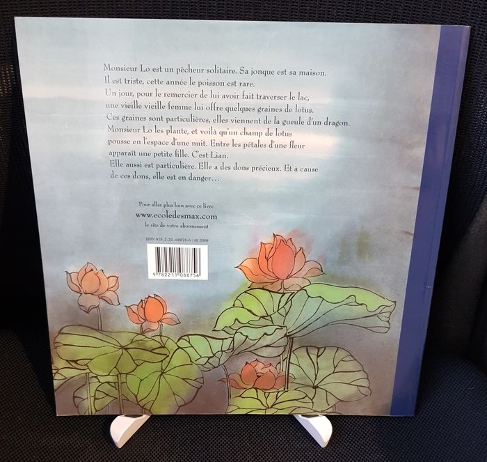 Monsieur Lo est un pêcheur solitaire. Sa jonque est sa maison. Il est triste, cette année le poisson est rare. Un jour, pour le remercier de lui avoir fait traverser le fleuve, une vieille femme lui offre quelques graines de lotus. Ces graines sont particulières, elles viennent de la gueule d'un dragon. Monsieur Lo les plante, et voilà qu'un champ de lotus pousse en l'espace d'une nuit. Entre les pétales d'une fleur apparaît une petite fille. C'est Lian. Elle aussi est particulière. Elle a des dons précieux. Et à cause de ces dons, elle est en danger... Édition souple Format 274x269 EAN 9782211088756 janv-08 Bon État, une bonne pliure en coin bas droit 1ère de couverture qui se répercute sur quelques feuilles, légères plissures le long de la reliure, intérieur TBE à part les légères pliures des premières feuilles, sans écritures. Une imposante liste de livres pour enfants disponible, essayez un premier contact ;-) Poids : 270 g