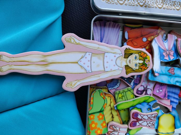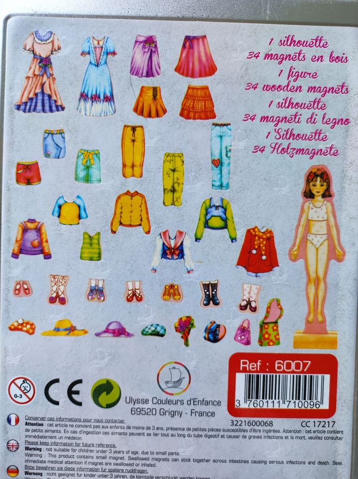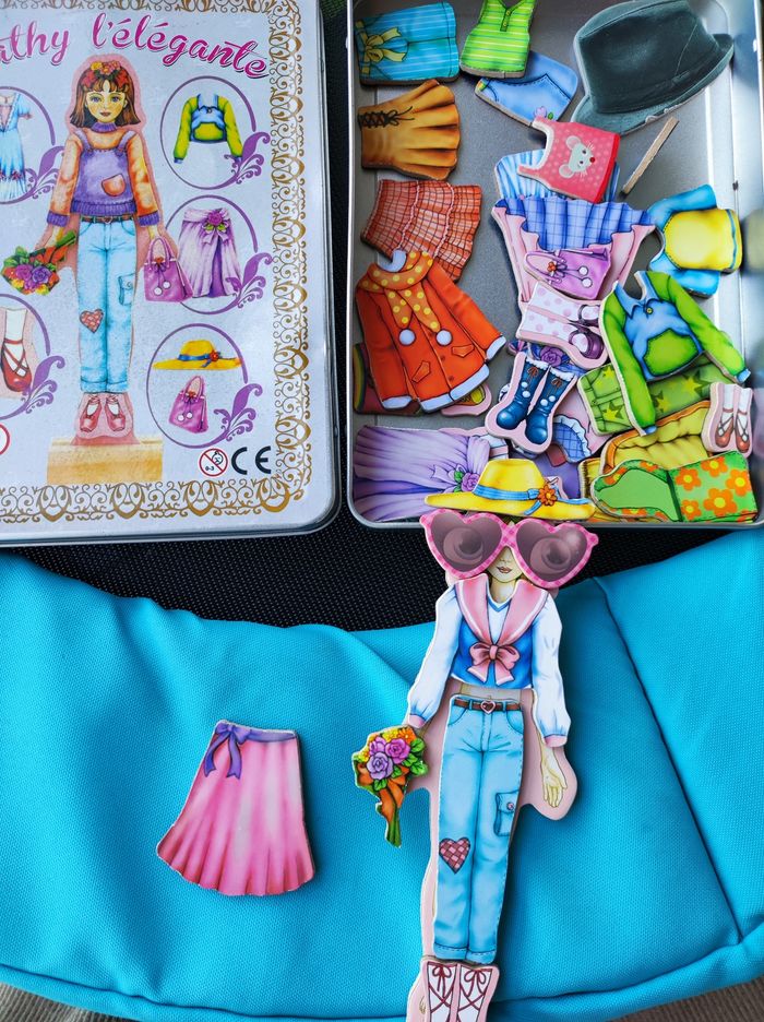 Cathy l’élégante. Présenté dans une boite en métal avec un support « silhouette » et 34 magnets en bois. Des robes, des pantalons, des jupes, des chaussures et accessoires... Très bon état Ulysse couleurs d' enfance J' ai d autres jouets enfants