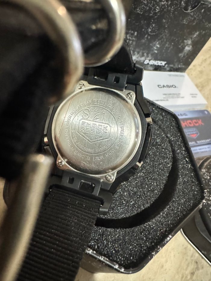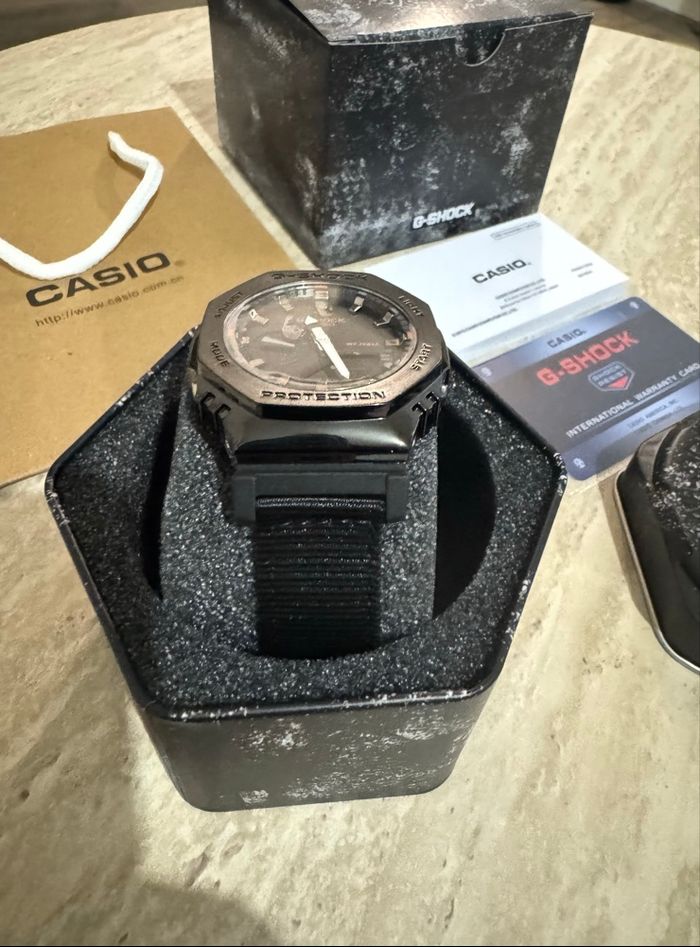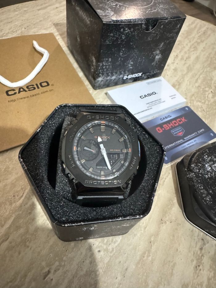 G-Shock GM-2100C (CasiOak) avec boîtier métal noir, cadran noir, détails orange et bracelet tissu noir. Modèle sport et premium, très robuste. Neuve, jamais portée Montre Boîte G-Shock Surboîte Carte G-Shock Notices Sac Casio Résistante aux chocs Étanchéité 200 m Affichage analogique + digital Verre minéral Envoi rapide et soigné