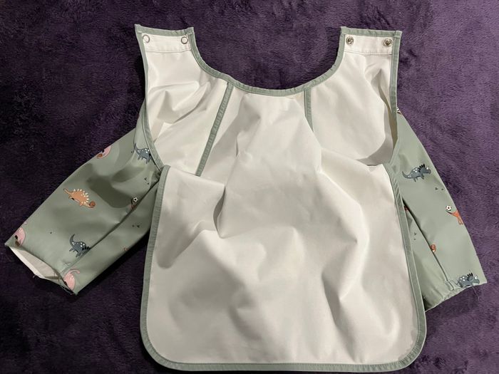 Bavoir tablier à motif dinosaures. Idéal pour commencer la diversification :). Tissu effet imperméable pratique pour nettoyer. Plus d'étiquette (Si besoin j'ai le ticket de caisse) et au niveau des poignets plus d'élastique. Etat moyen. #bavoirkiabi #bavoirtablierkiabi #tablierrepas