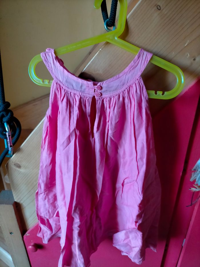 TBE Très jolie robe sans manche en voile de coton rose. Fleurs en relief sous le col, deux boutons au dos et zip sur le côté. Très raffinée