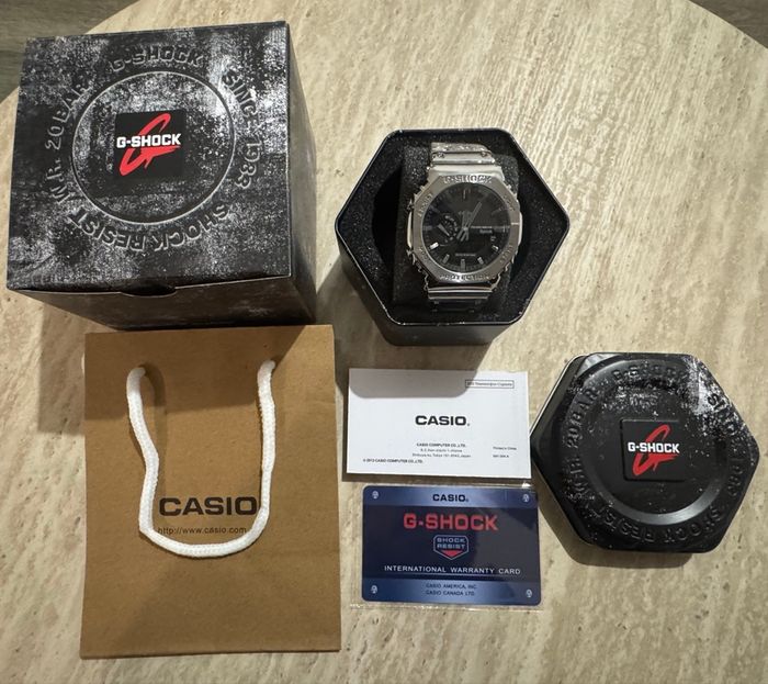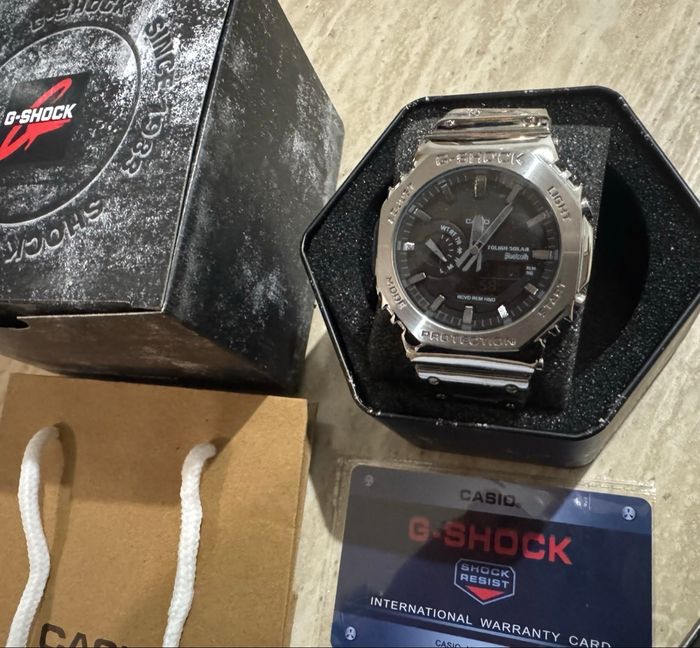 G-Shock GM-B 2100 avec boîtier et bracelet en métal, cadran noir et finitions premium. Modèle robuste, élégant et très recherché. Montre Neuve, jamais portée Boîte G-Shock Surboîte Carte G-Shock Notices Sac Casio Résistante aux chocs Étanchéité 200 m Affichage analogique + digital Verre minéral Envoi rapide et soigné