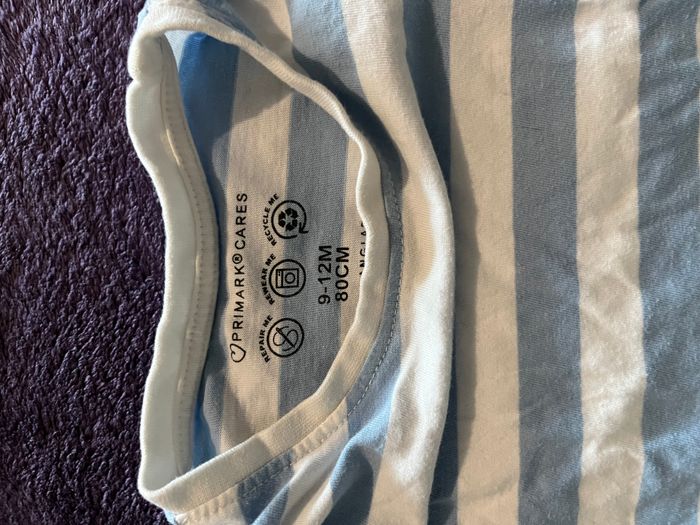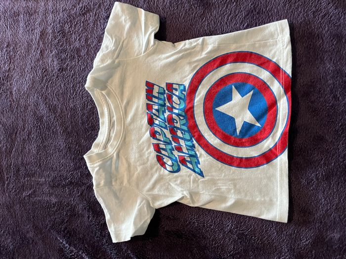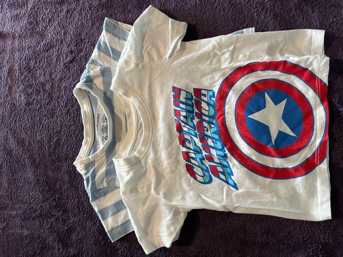 Lot en détail : - 1 t-shirt à manches courtes blanc Marvel Captain America marque Primark – motif bouclier et logo coloré - 1 t-shirt à manches courtes rayé bleu clair/blanc coupe classique marque Primark 📏 Taille : 9/12 mois – 80 cm 📍 Bon état 💥 Idéal pour les petits fans de super-héros ou pour un look estival décontracté #primark #primarkbebegaron #primarkbebegarcon9mois #primarkmarvel