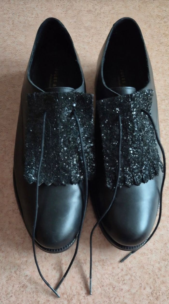 Derbies en Cuir Noir JULES & JENN ​Paire de derbies en cuir noir, fabriquée au Portugal. ​Matière : tout cuir (dessus et intérieur). ​Hauteur Talon : 2,7 cm. ​Détail : vendues avec les franges amovibles à paillettes . ​Etat : trés bon état , peu portée . ​ #Derbies #Richelieu #Paillettes #MadeInPortugal #fetes #bocage #mellowyellow #sezane #claudiepierlot #jonak #odaje